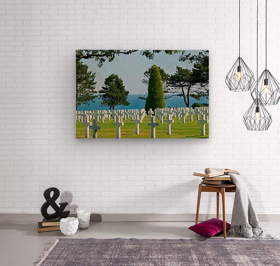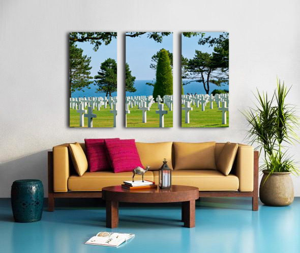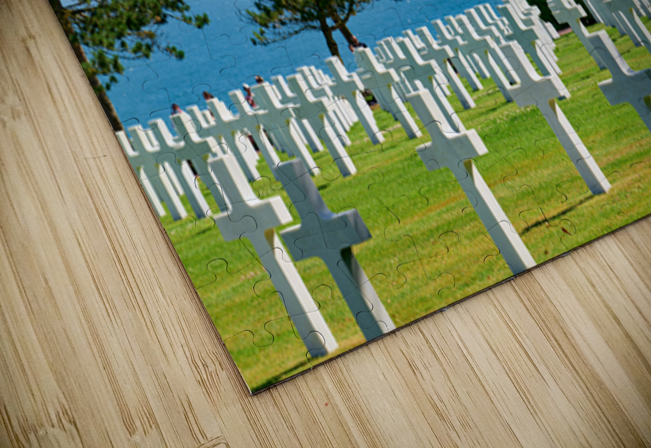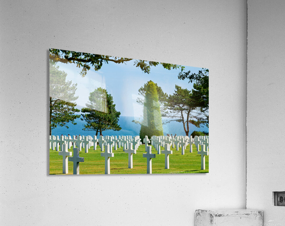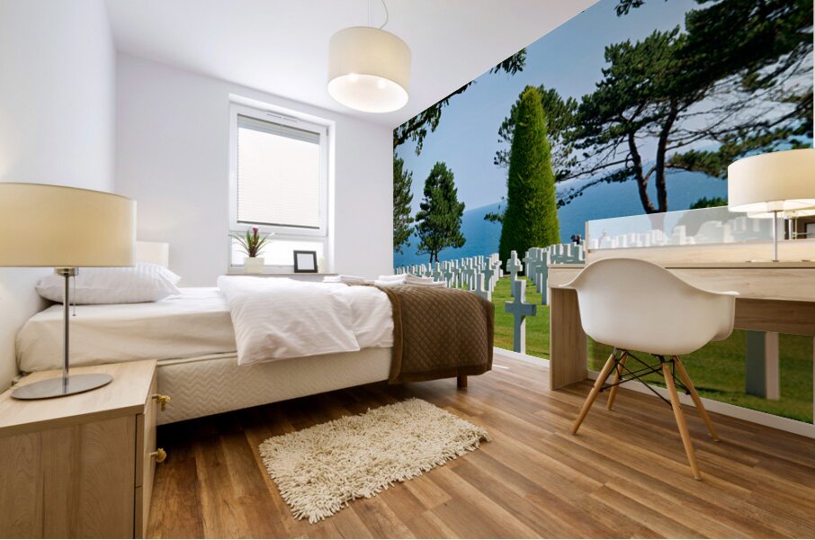 Grave markers stand in rows at the Normandy American Cemetery in Colleville sur Mer. The ocean glimmers in the background under a blue sky.