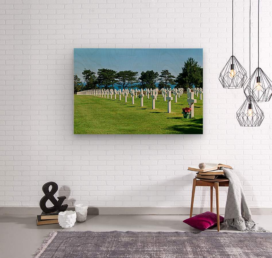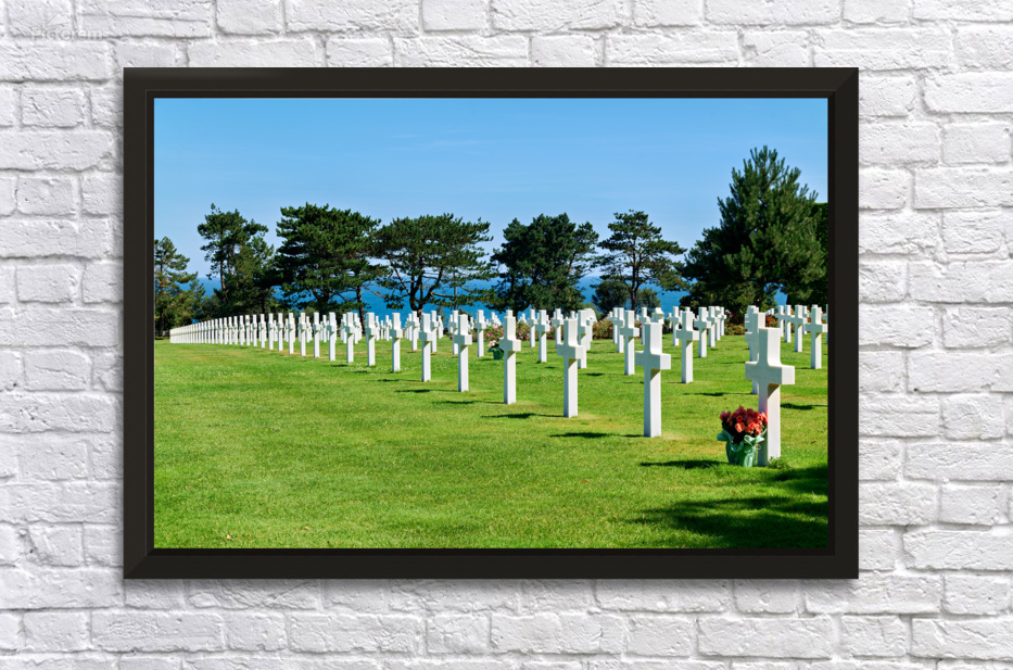 Grave markers stand in neat rows at the Normandy American Cemetery in Colleville sur Mer France under a blue sky with green grass.