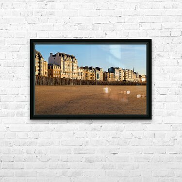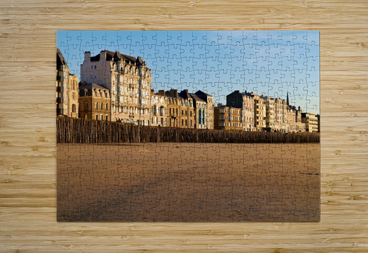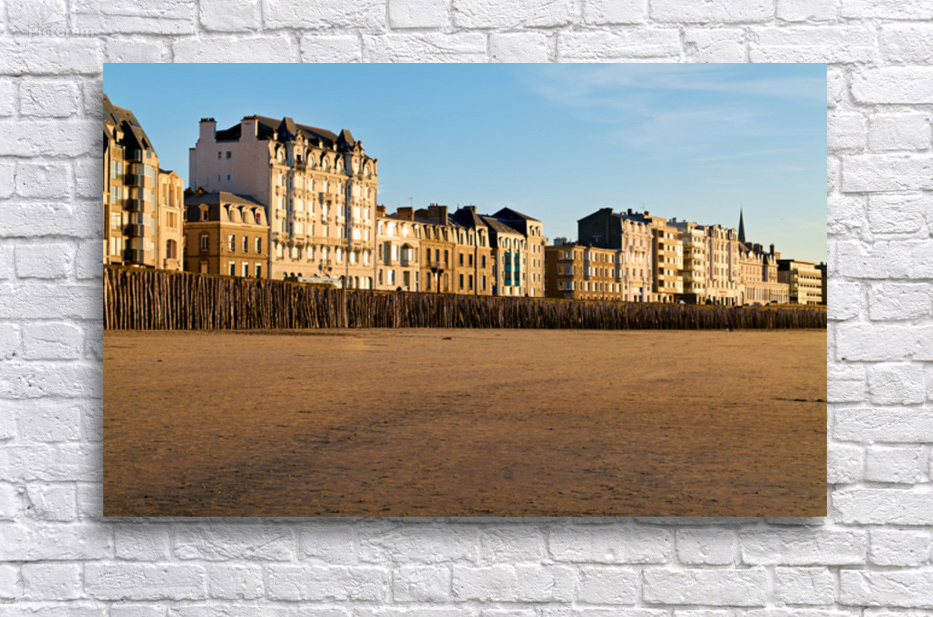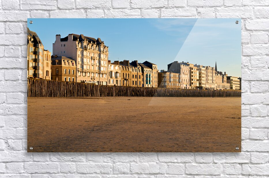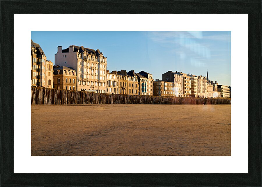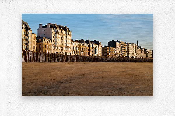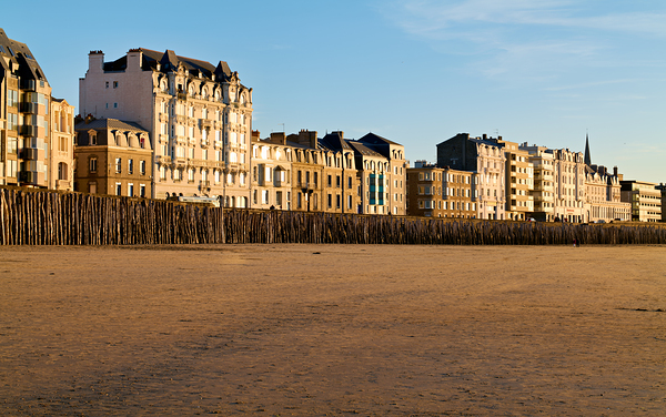 People walk along Grand plage du Sillon at dusk. The sun sets behind the buildings casting long shadows on the sand.