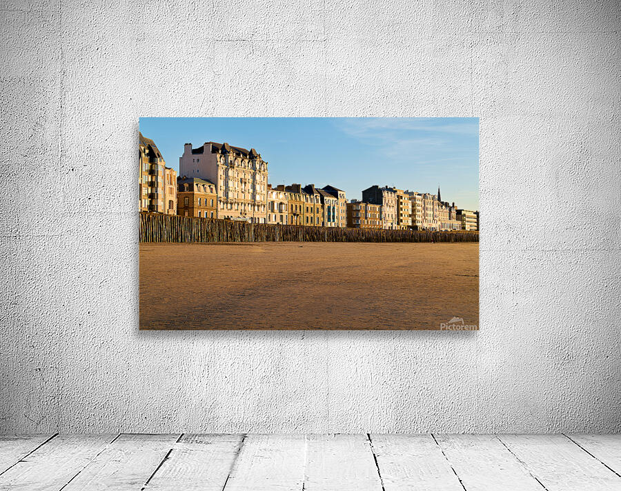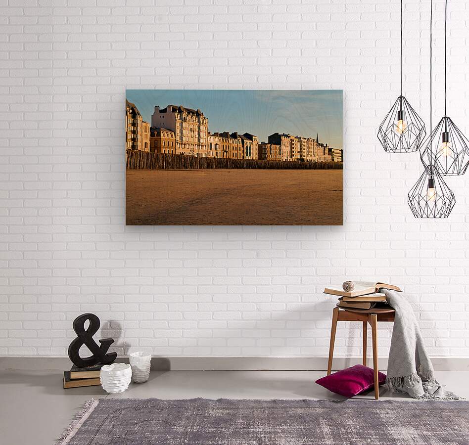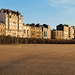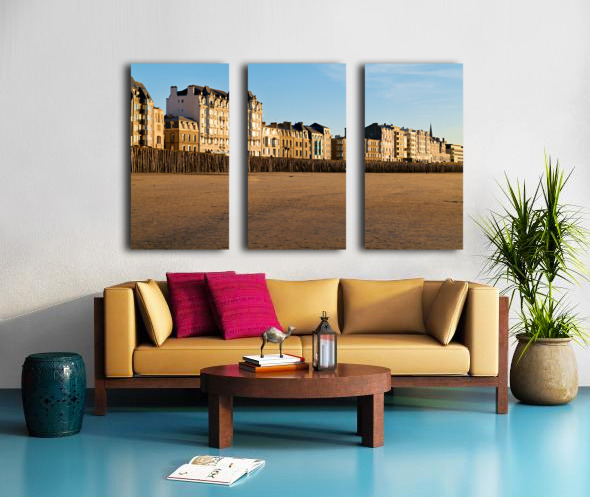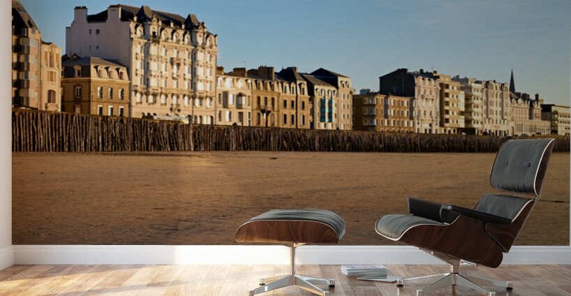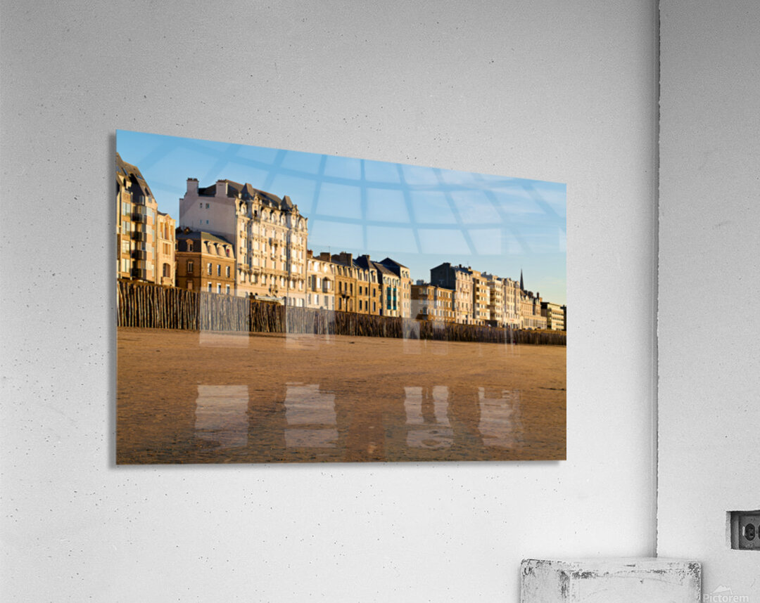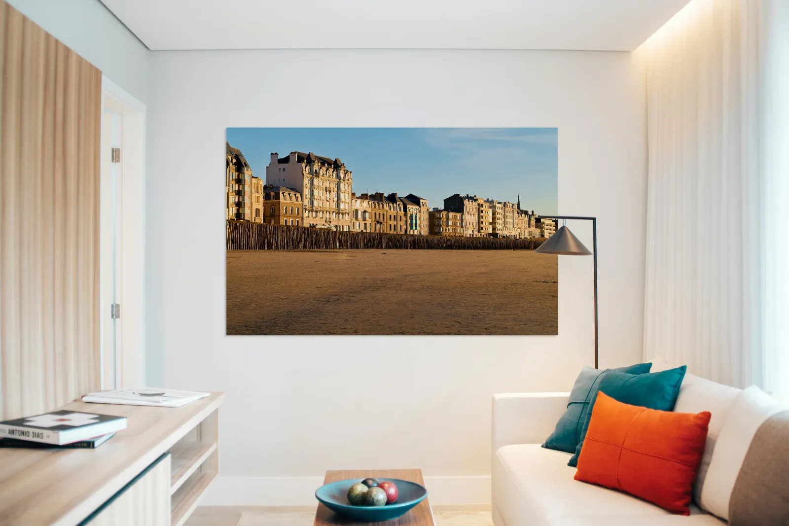 People walk along Grand plage du Sillon at dusk. The sun sets behind the buildings casting long shadows on the sand.