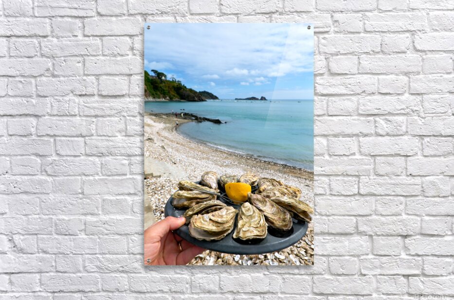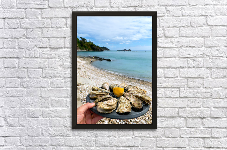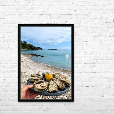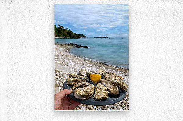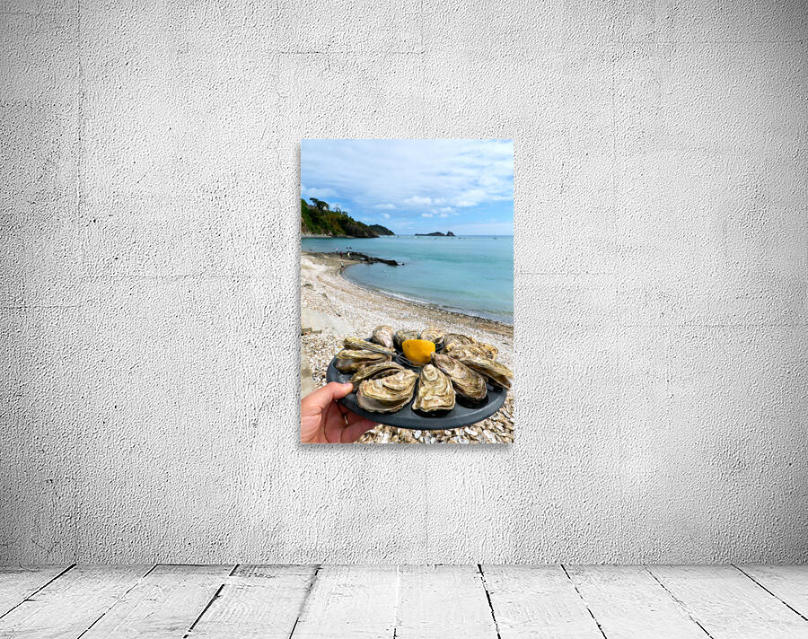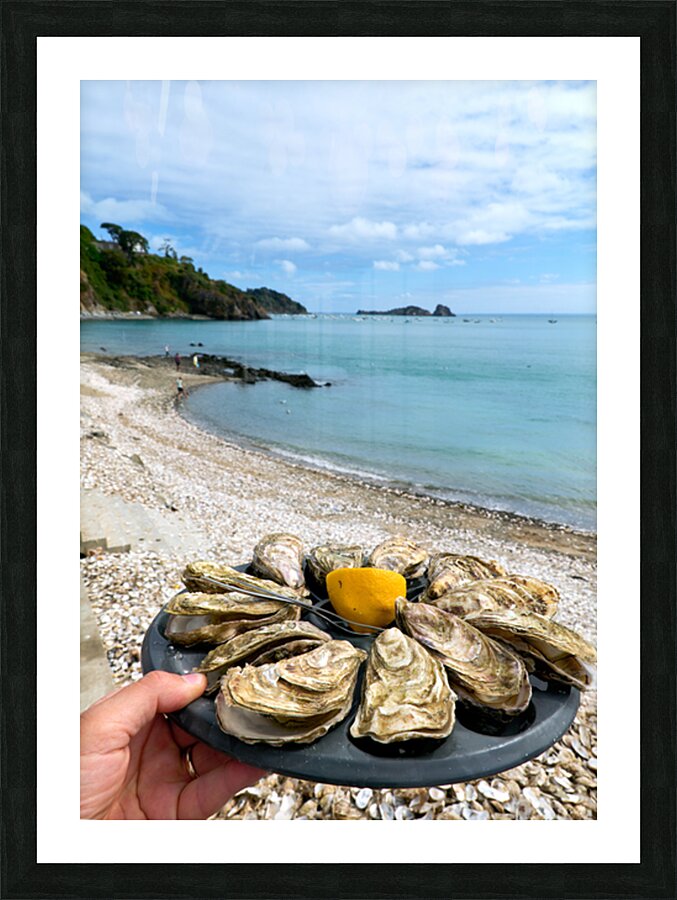 Fresh oysters are displayed on a plate at the beach in Cancale Brittany France. People can be seen enjoying the view and the sea.