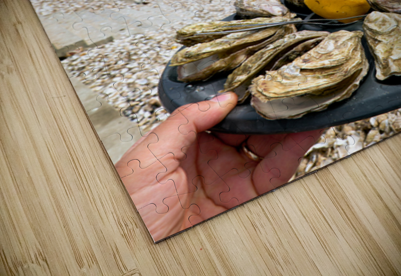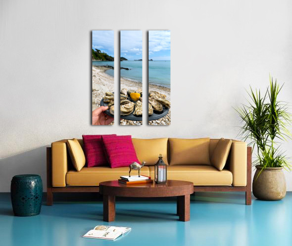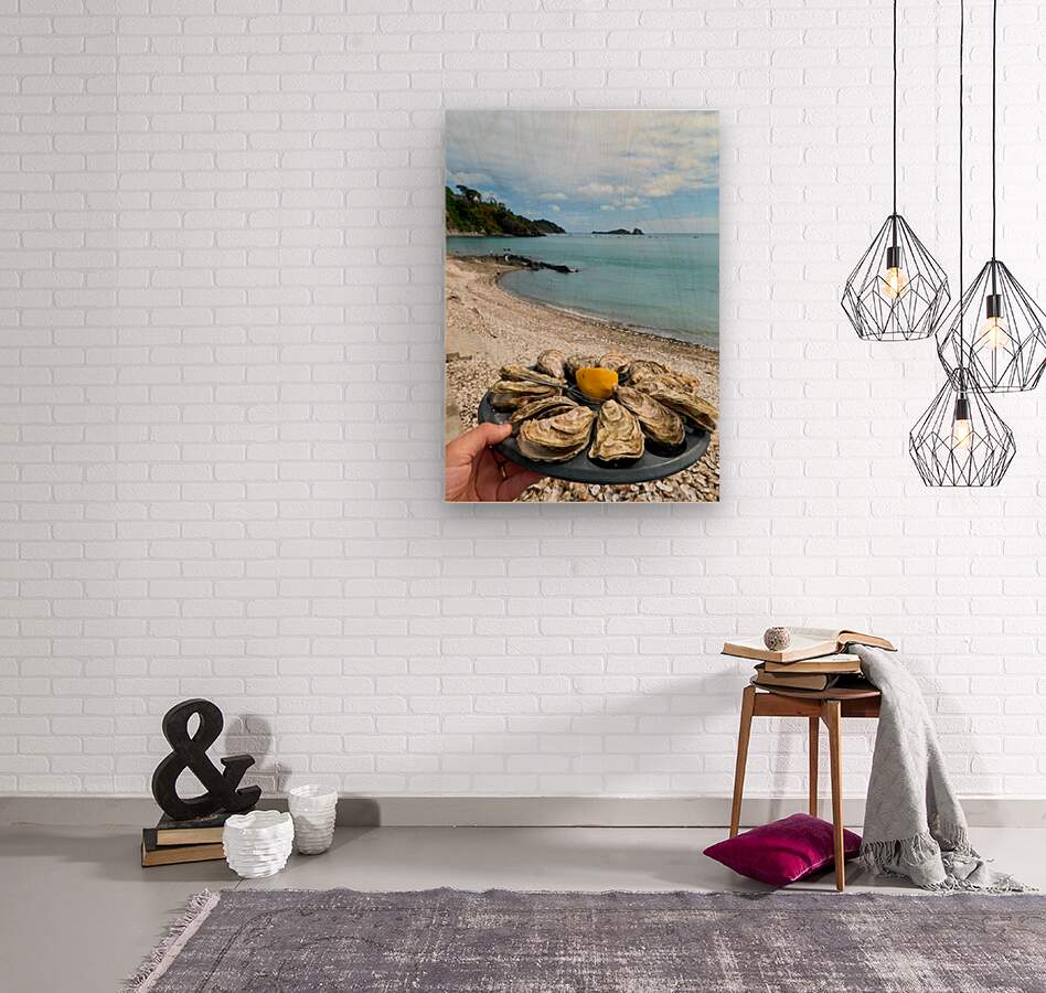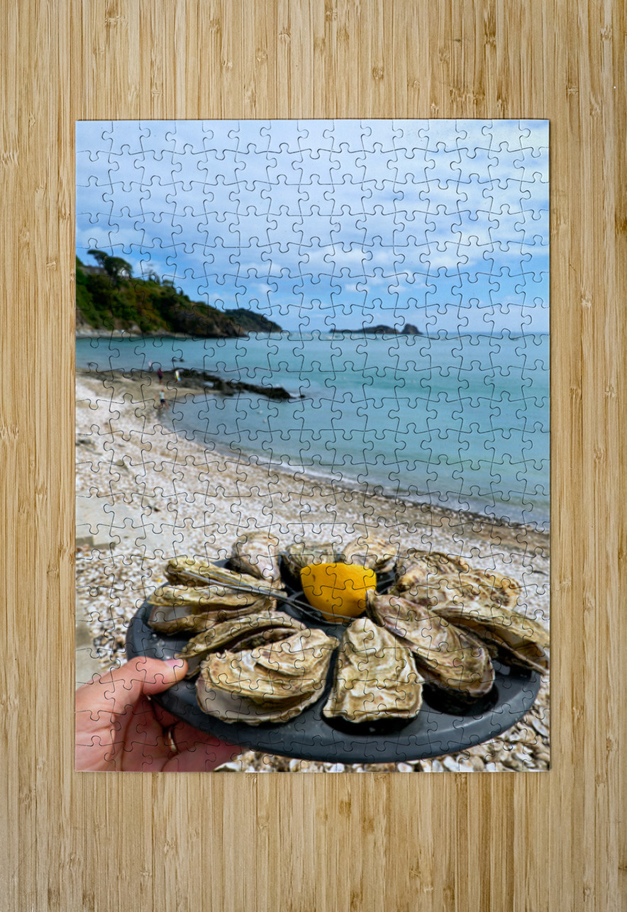 Fresh oysters are displayed on a plate at the beach in Cancale Brittany France. People can be seen enjoying the view and the sea.