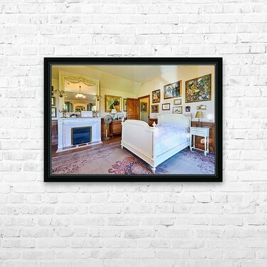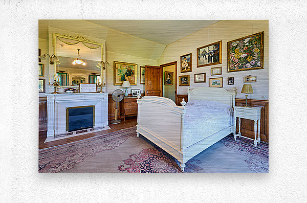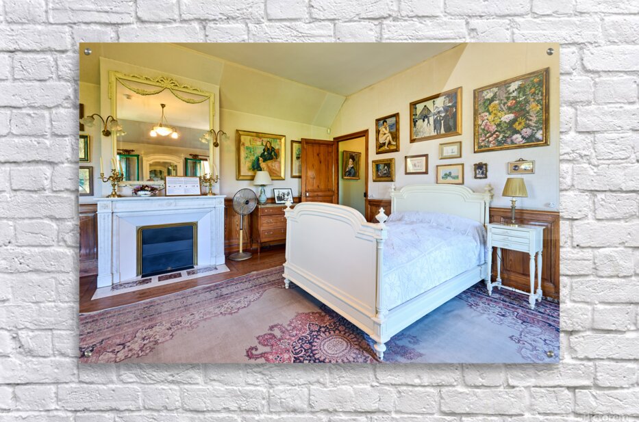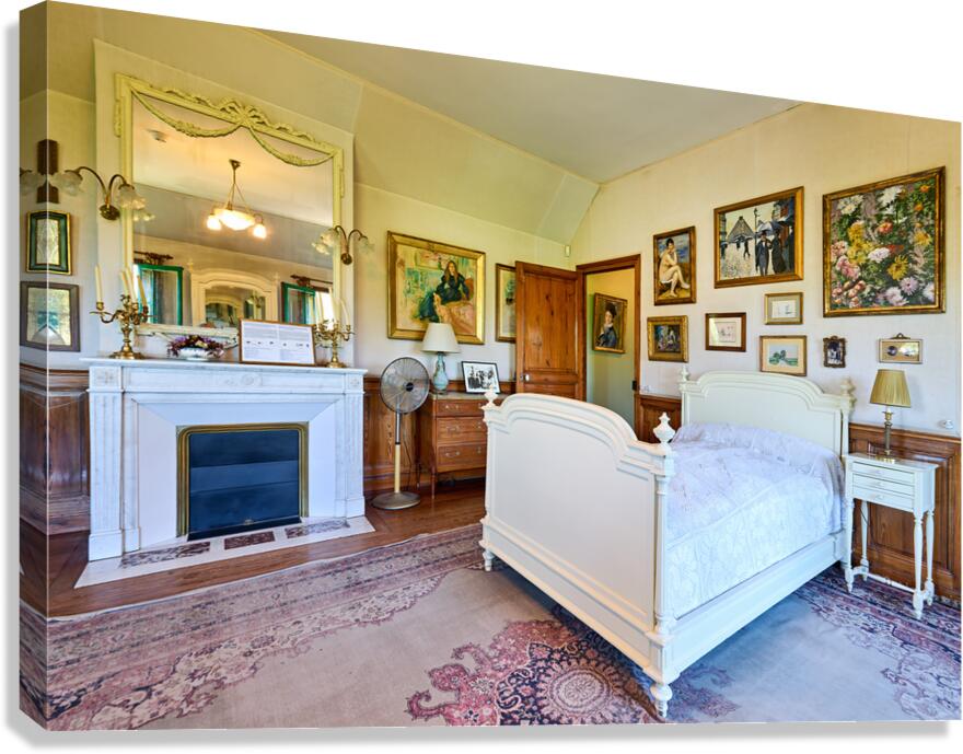 A room in Monets house in Giverny Normandy displays art and furniture. The room has a bed a fireplace and many framed pictures on the walls.