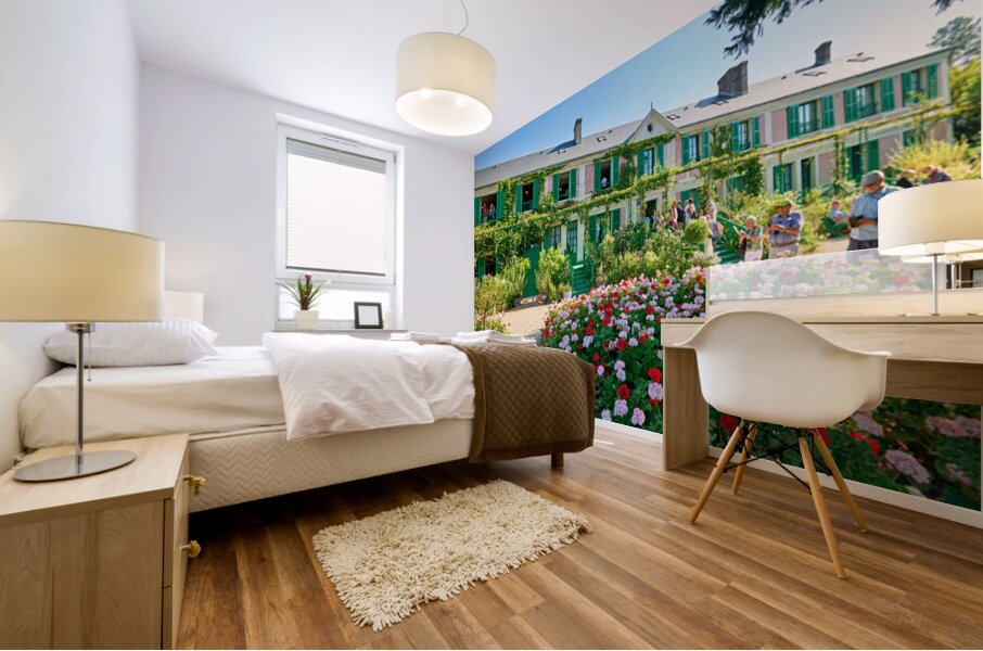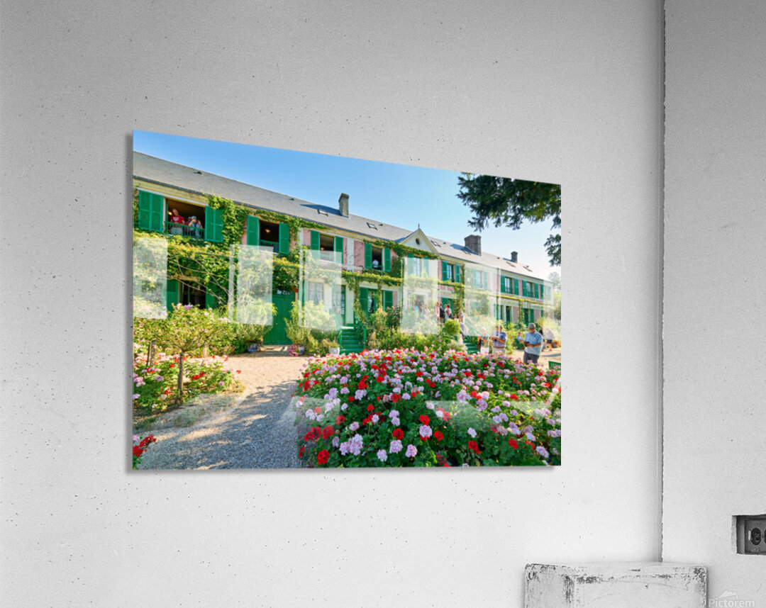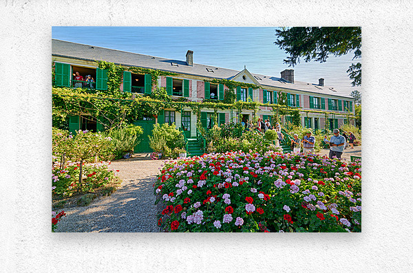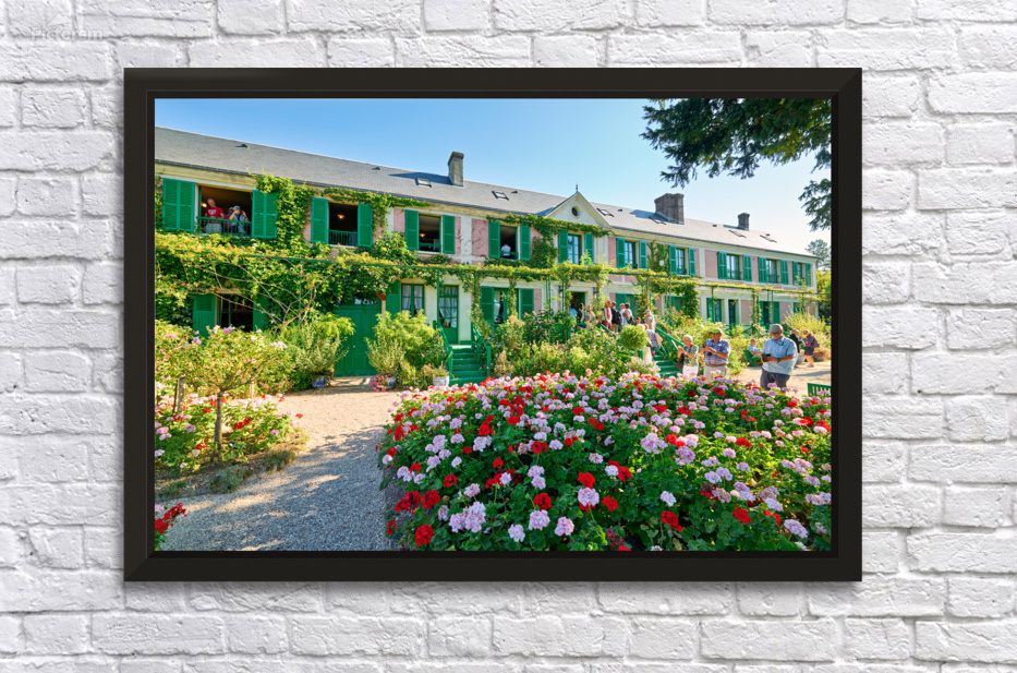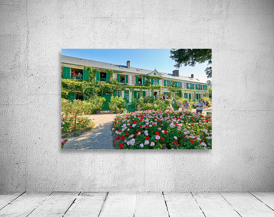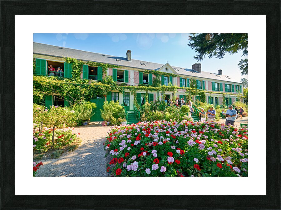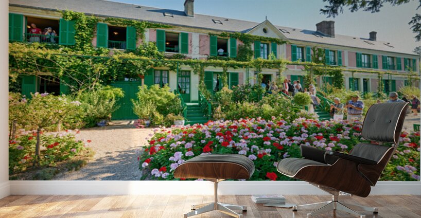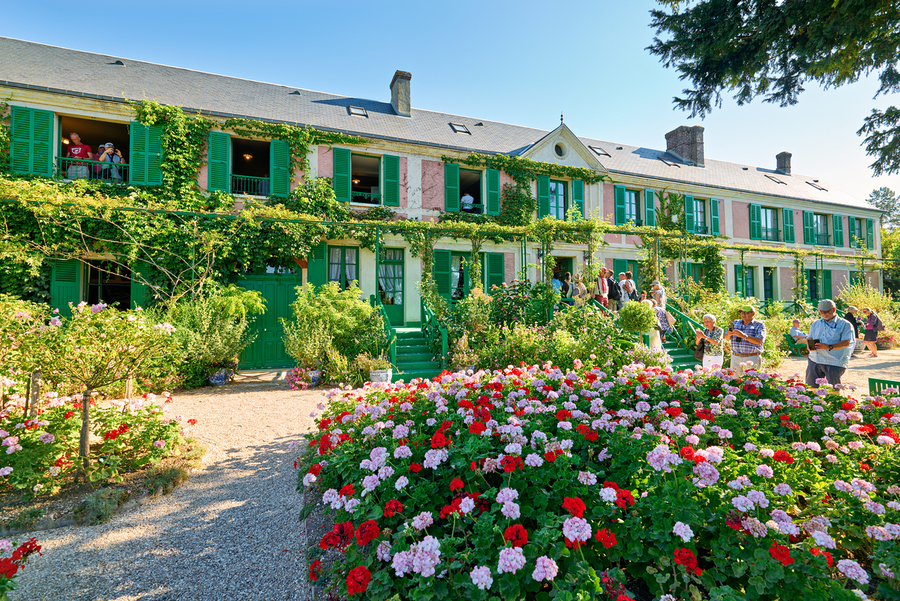 Tourists gather outside Monets house in Giverny. The garden is full of colorful flowers. It is a sunny day in Normandy.