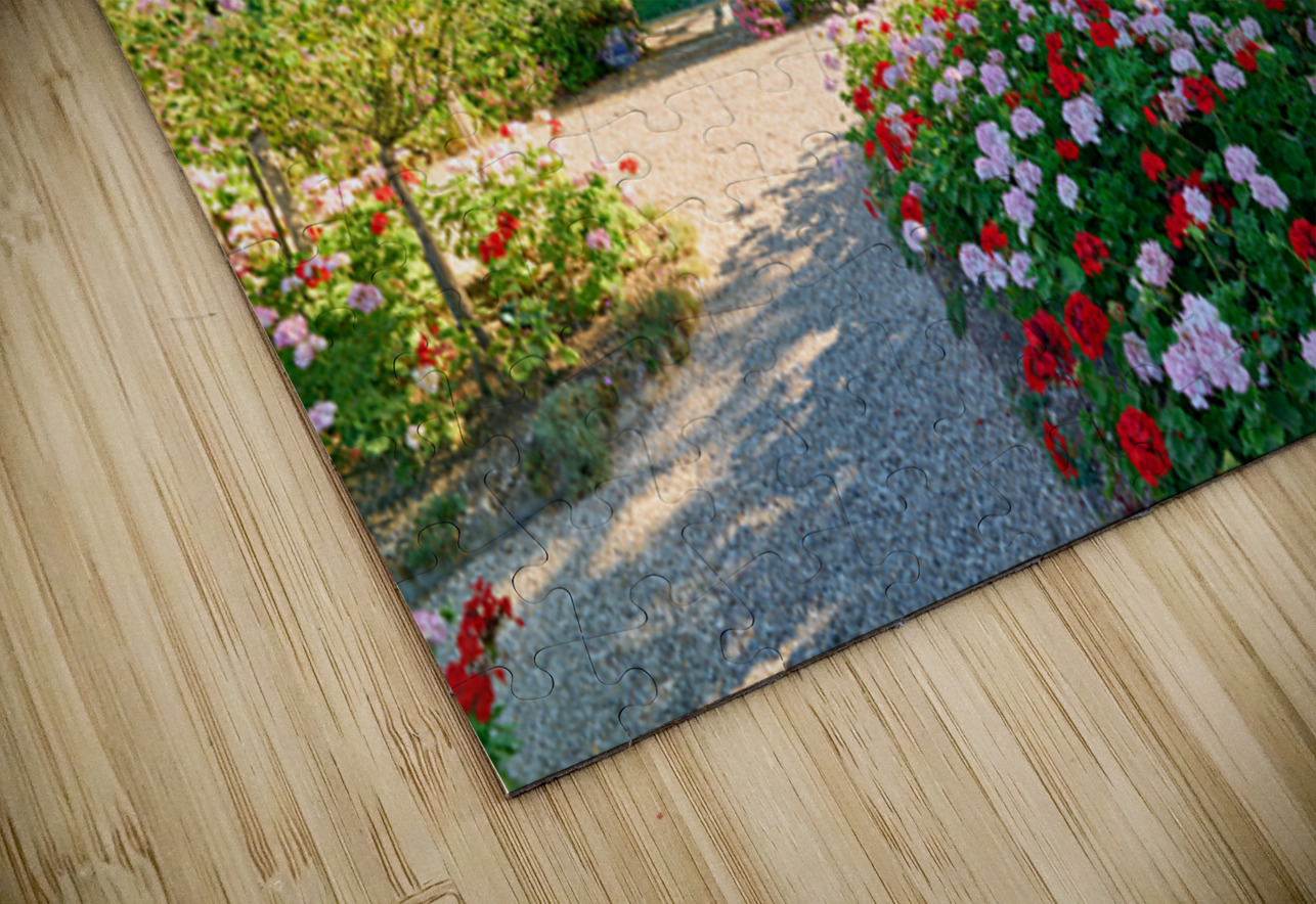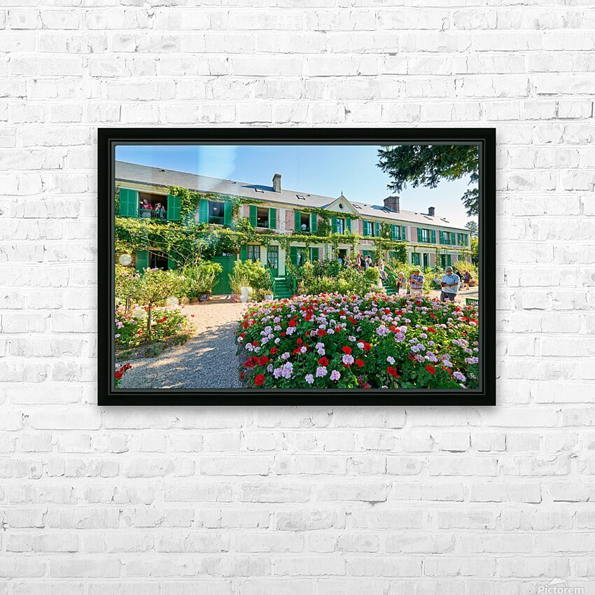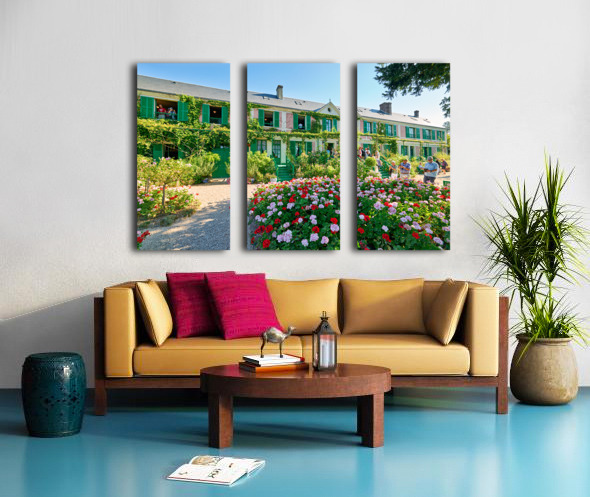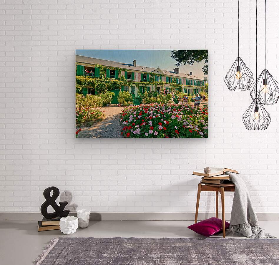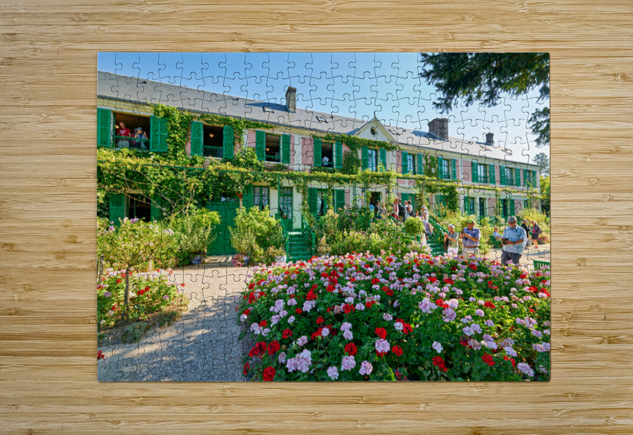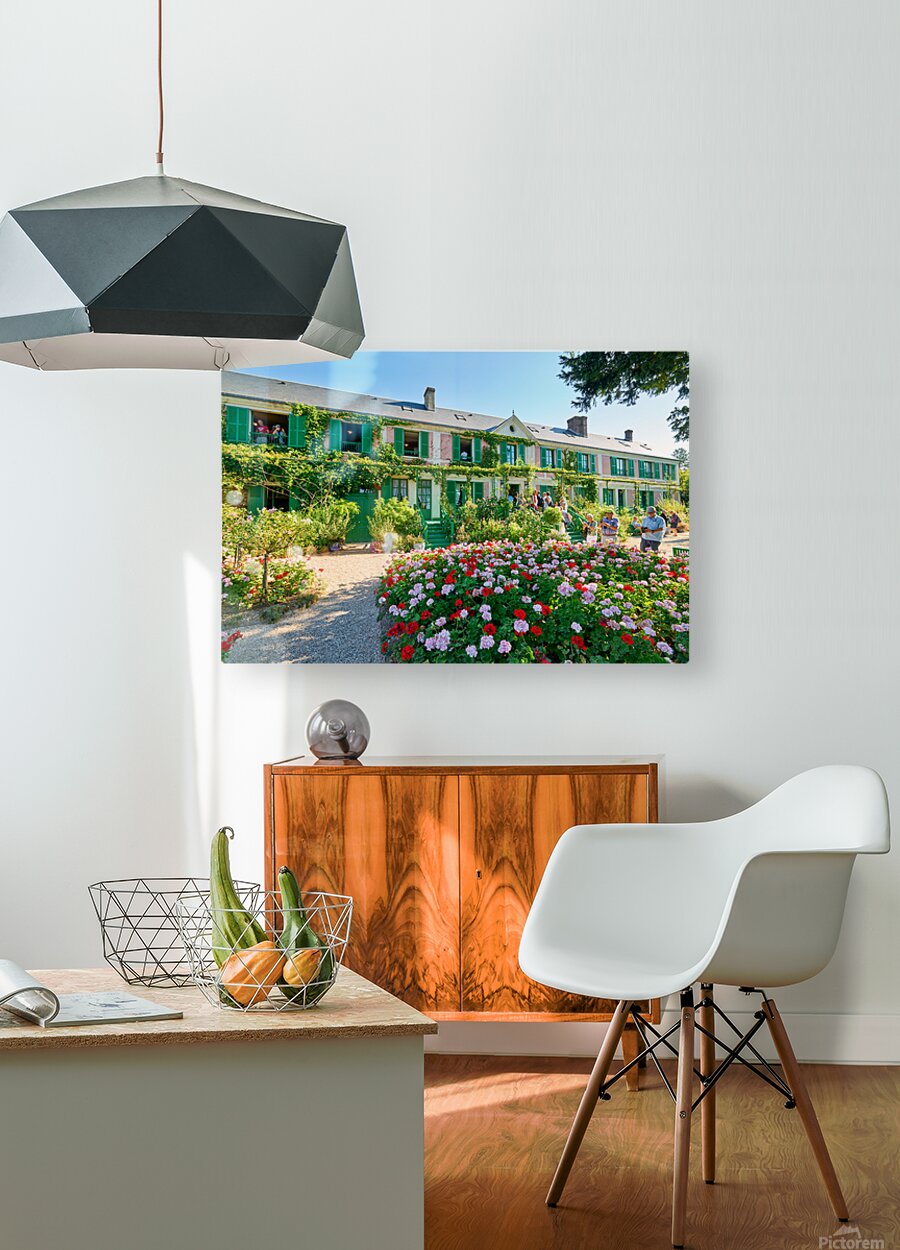 Tourists gather outside Monets house in Giverny. The garden is full of colorful flowers. It is a sunny day in Normandy.