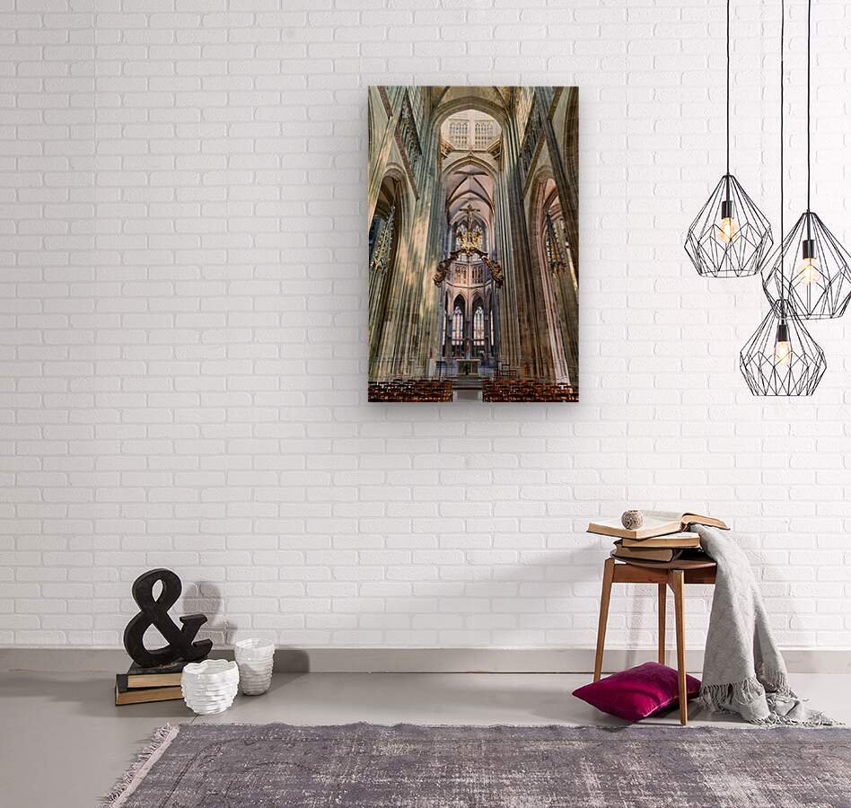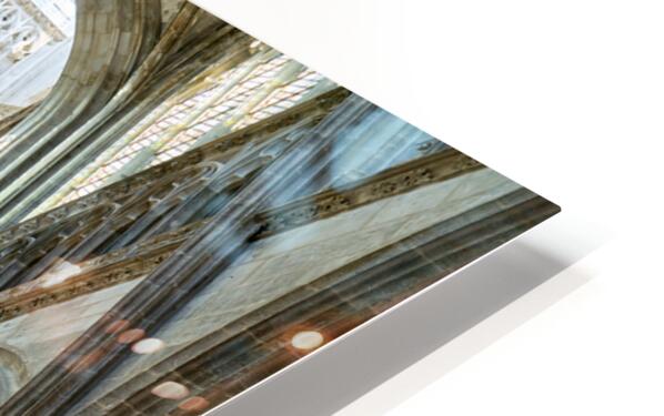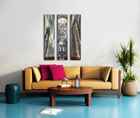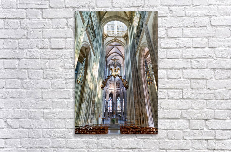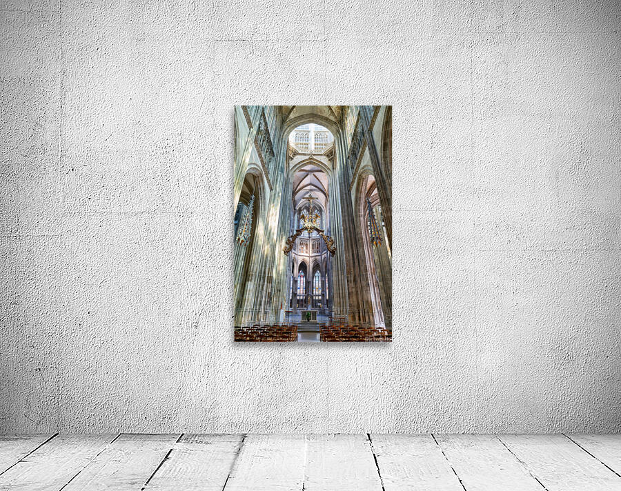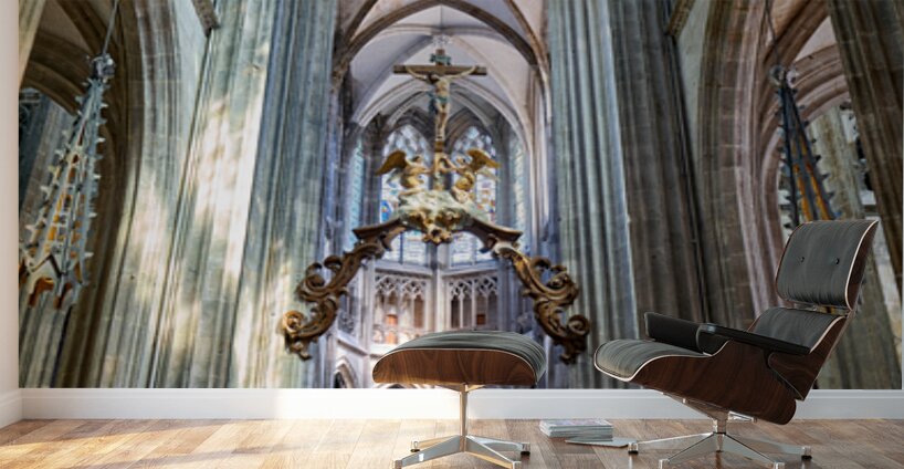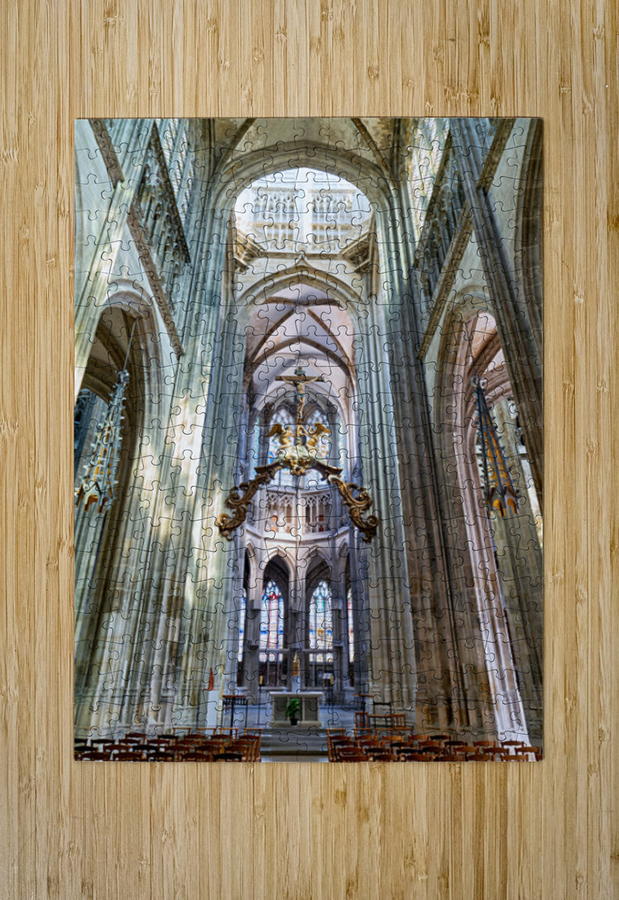Visitors walk through Saint Maclou church in Rouen Normandy. The tall arches and stained glass are part of the beautiful structure.