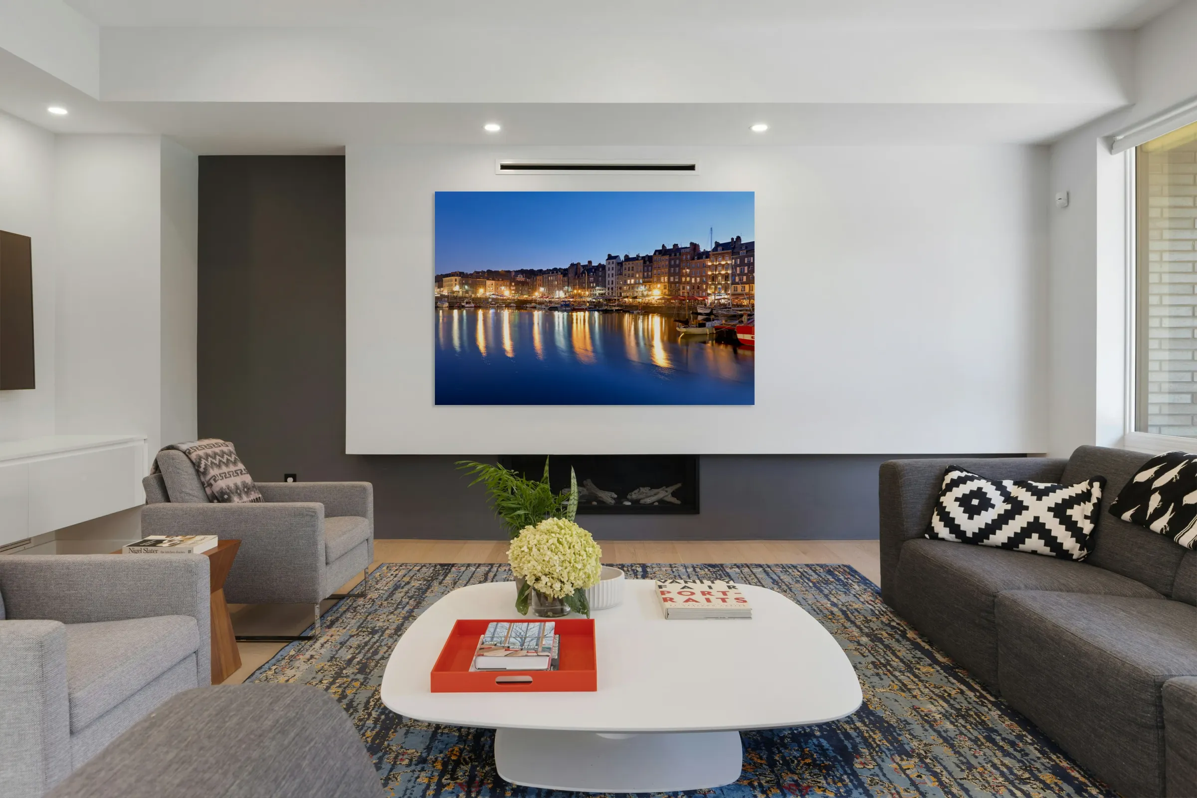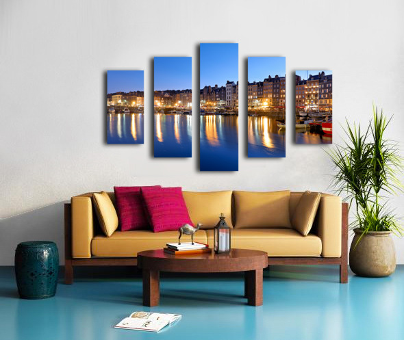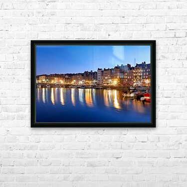 Harbour view of Honfleur at dusk with boats and buildings Frame print