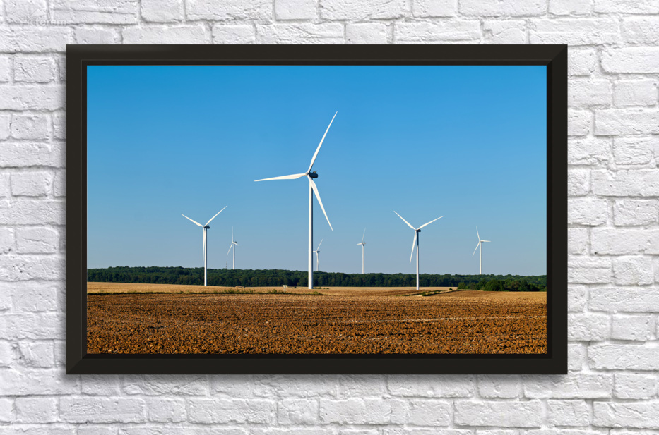 Wind turbines stand tall in a field in Bourgogne France. They generate wind energy in a clear sky with no clouds.