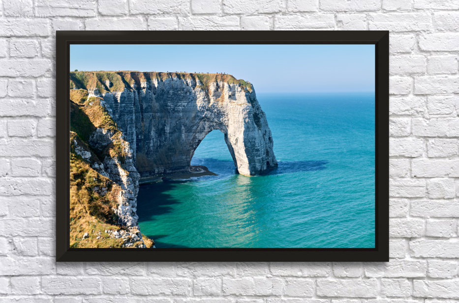 Visitors view the chalk cliffs of Etretat as waves crash against the shore. The sun shines brightly over the clear blue water.