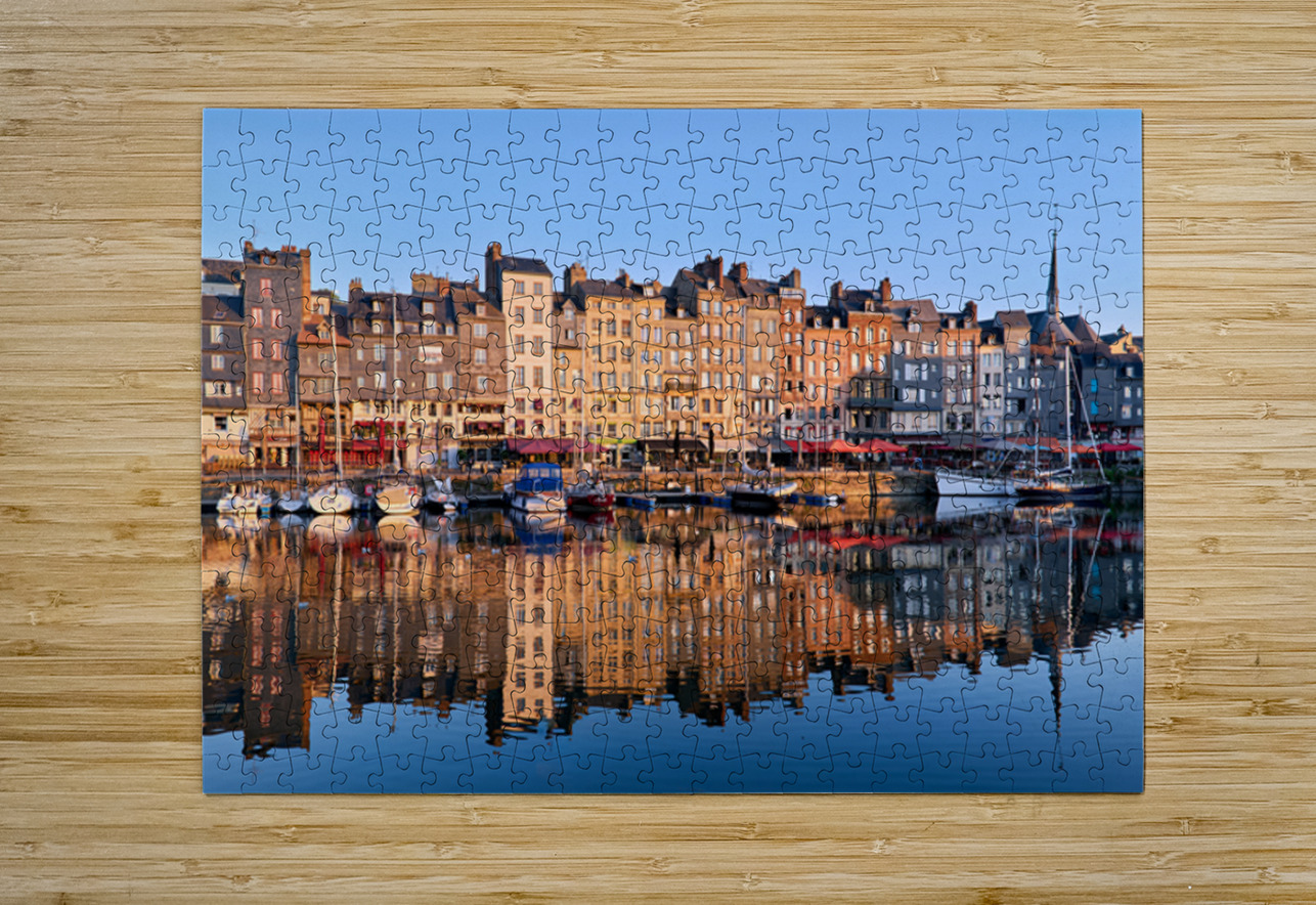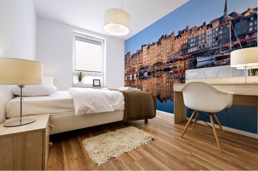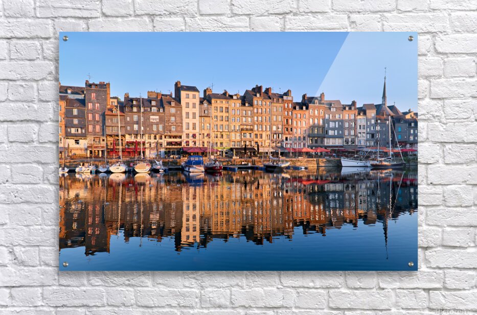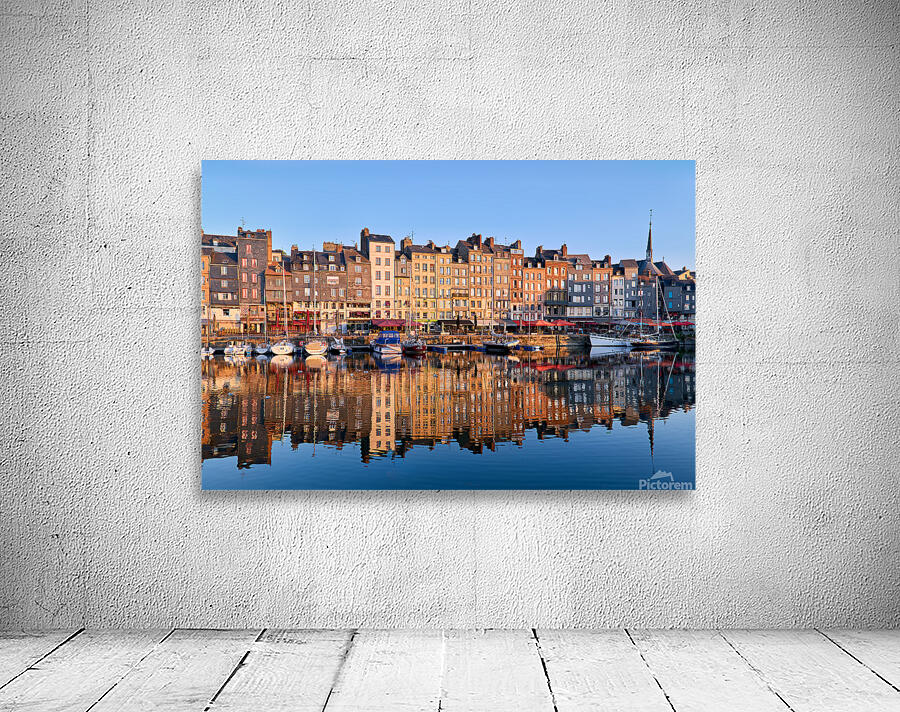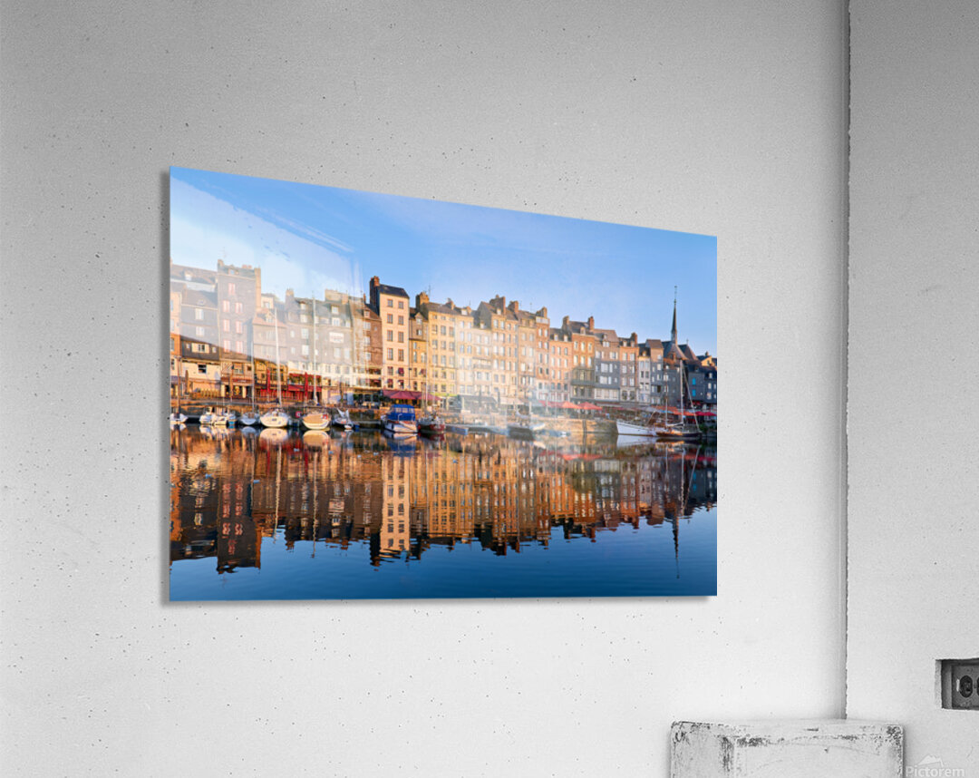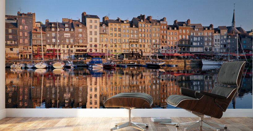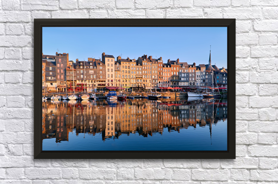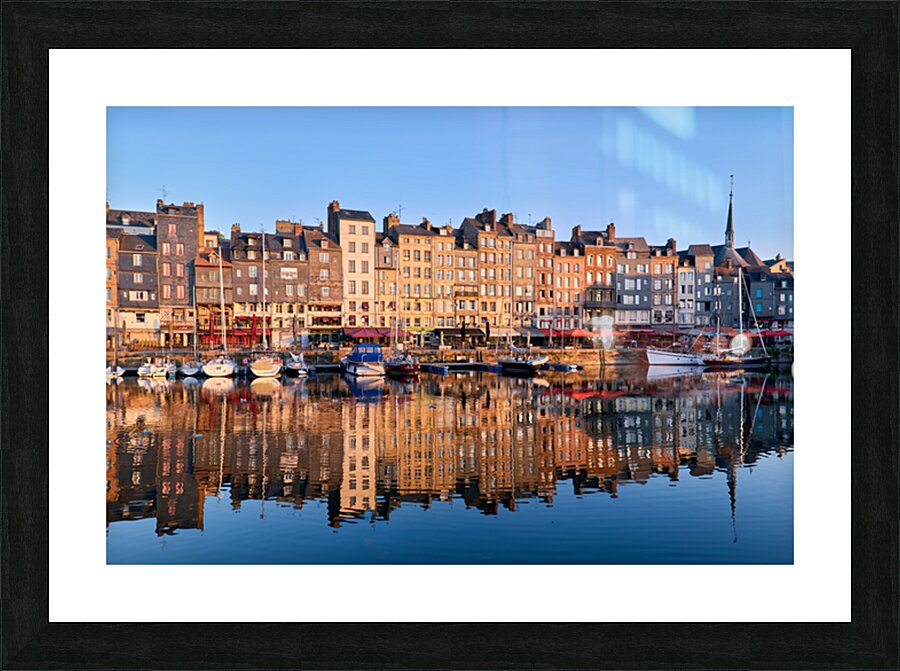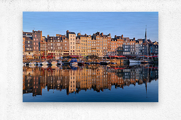 Boats float in the water while buildings reflect on the harbour. The scene captures the start of a new day in Honfleur.
