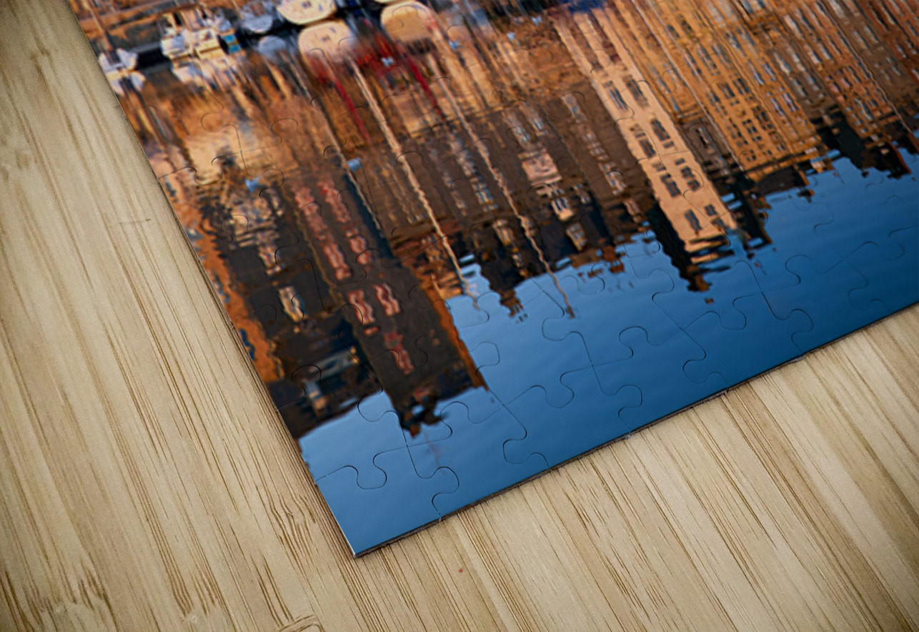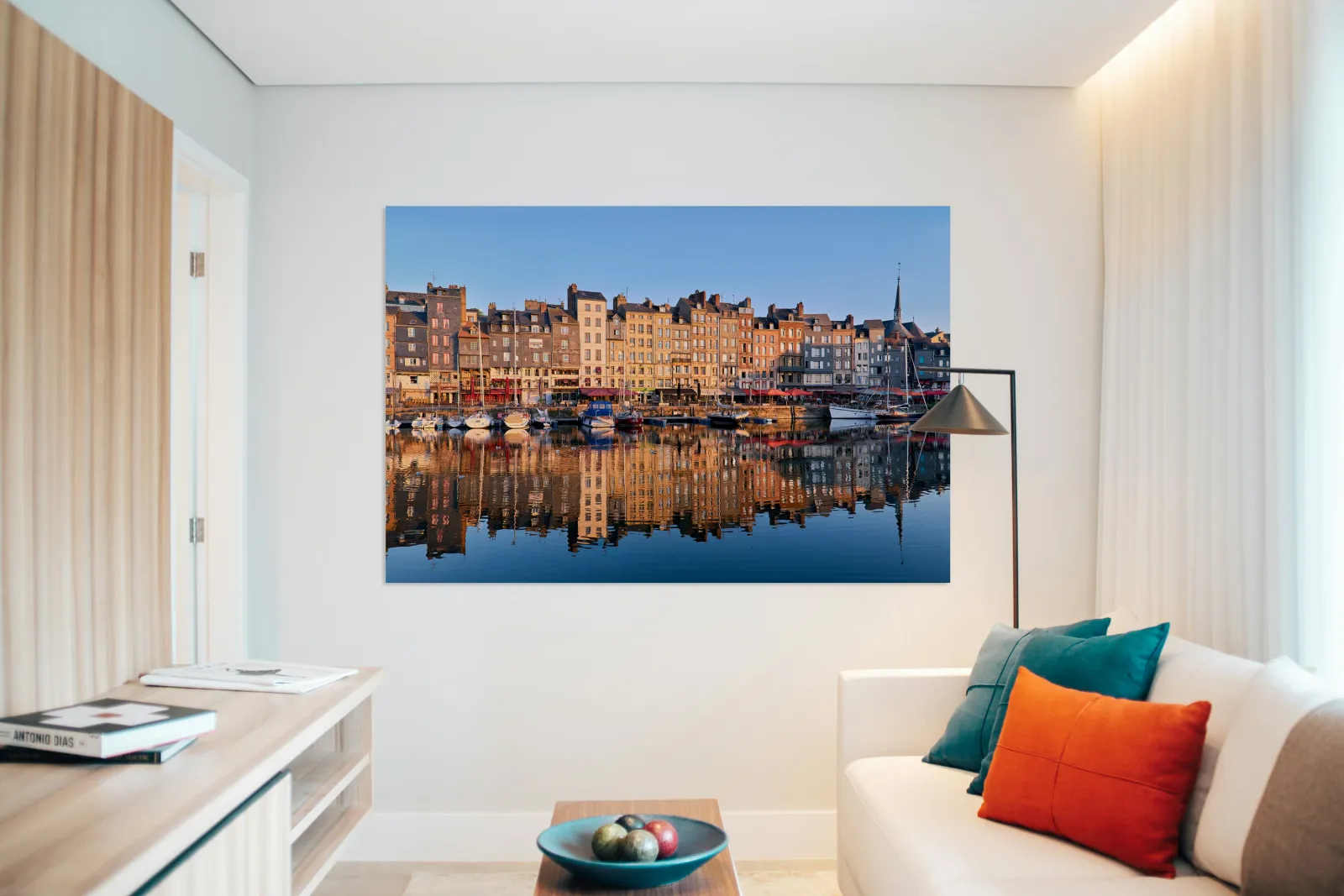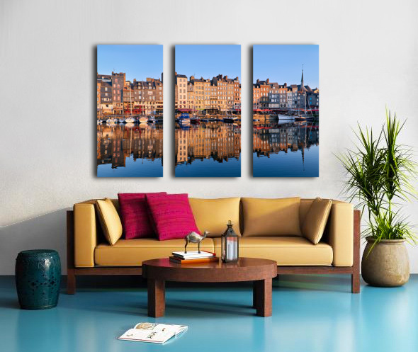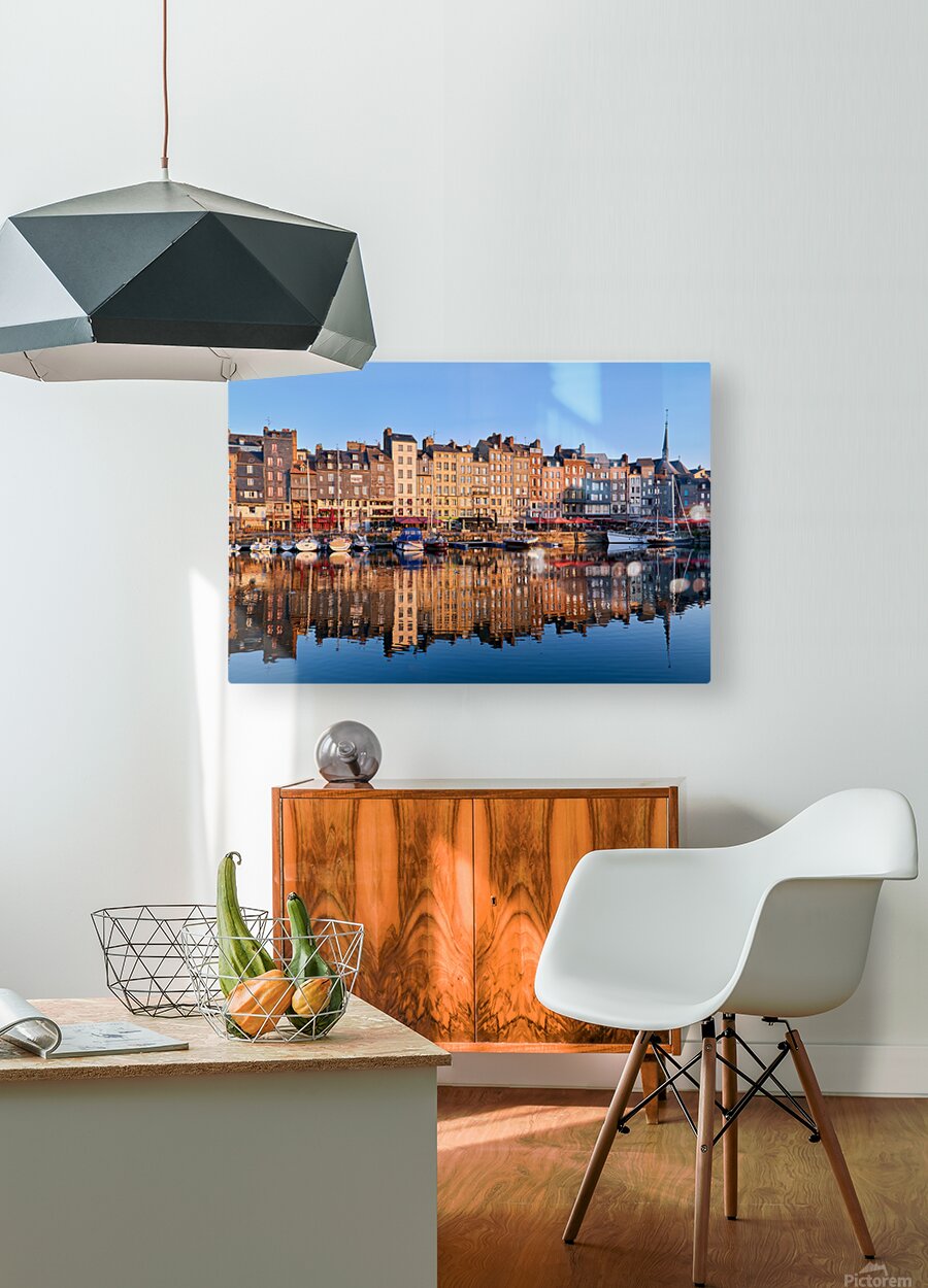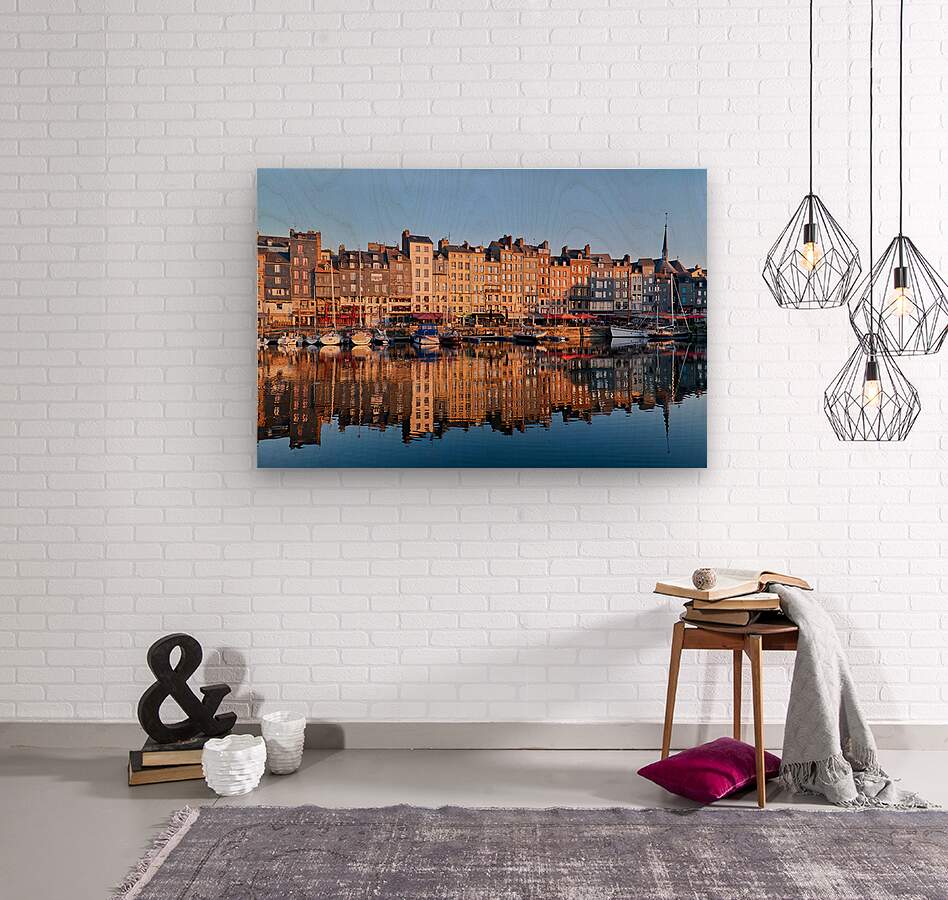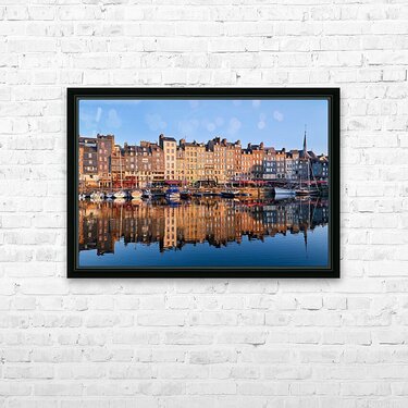 Boats float in the water while buildings reflect on the harbour. The scene captures the start of a new day in Honfleur.