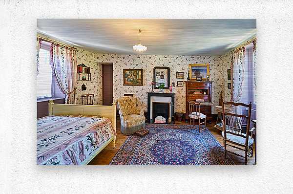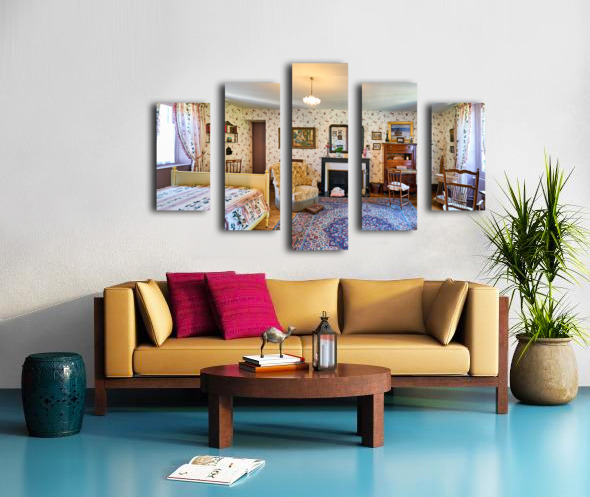 Explore the interior of Monets house in Giverny Normandy. The room features a bed chair and a writing desk with historic decor.