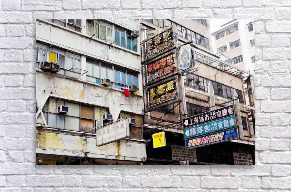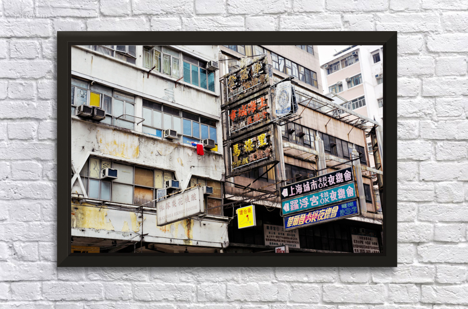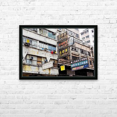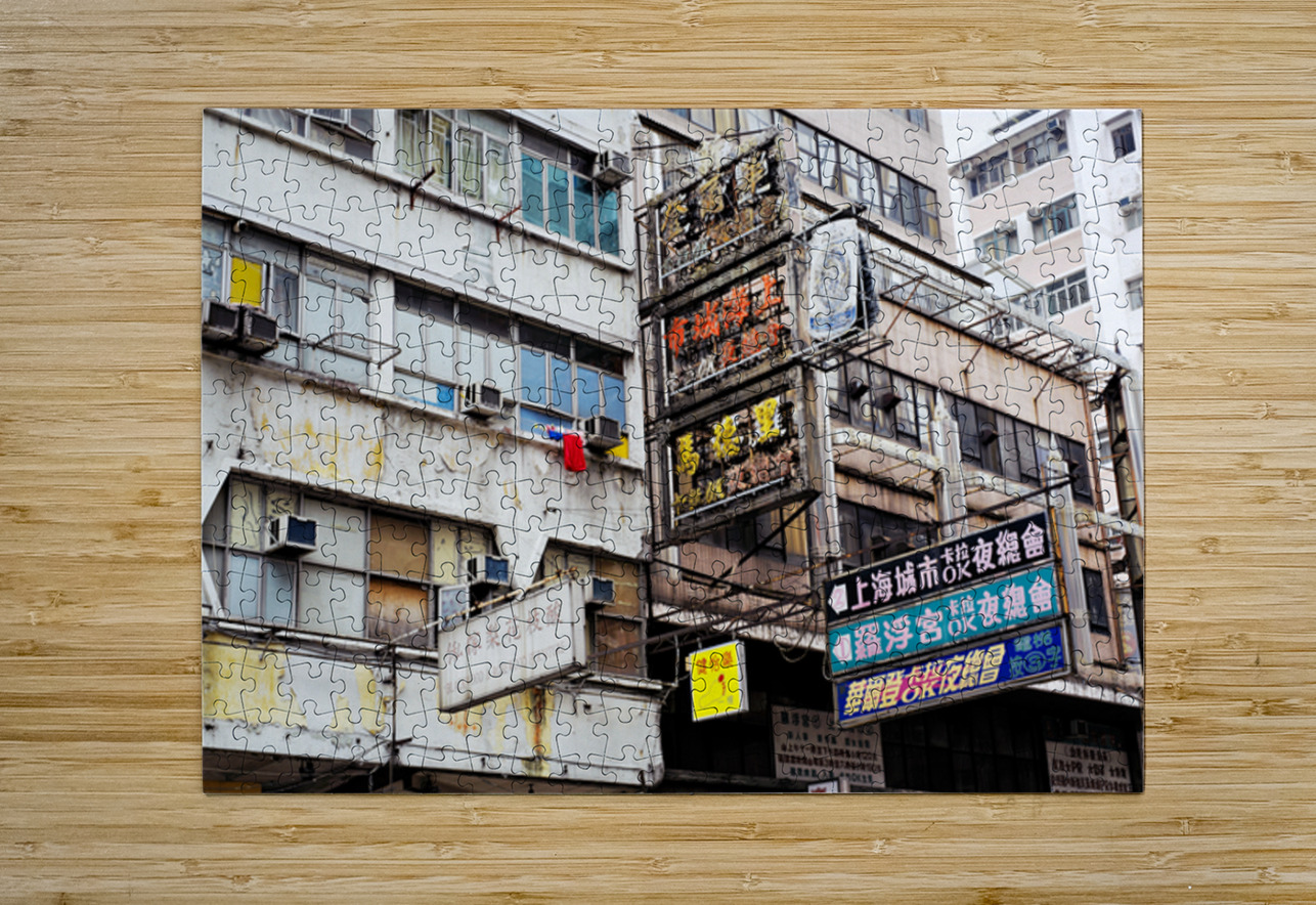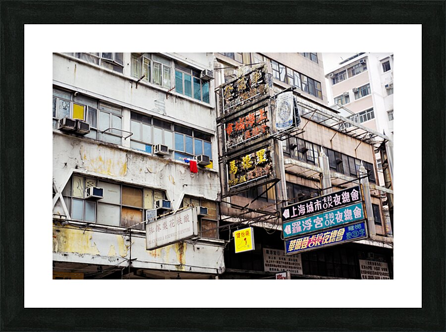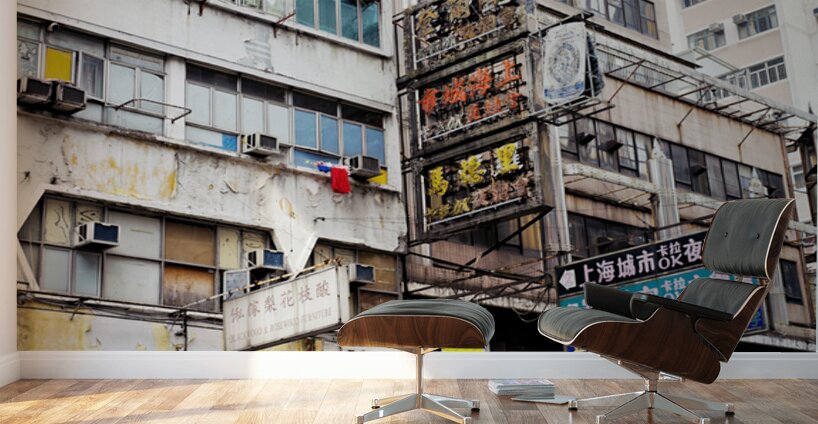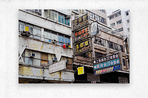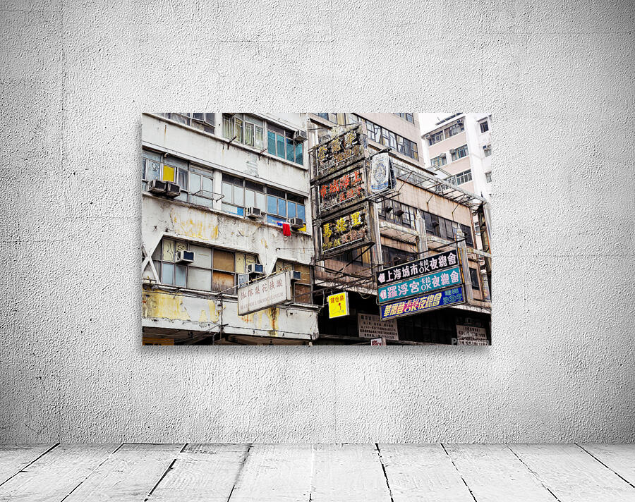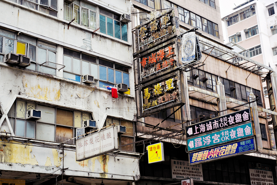 Buildings in Hong Kong show signs of age covered in Chinese signs and laundry hanging outside. The scene reflects daily life and culture.