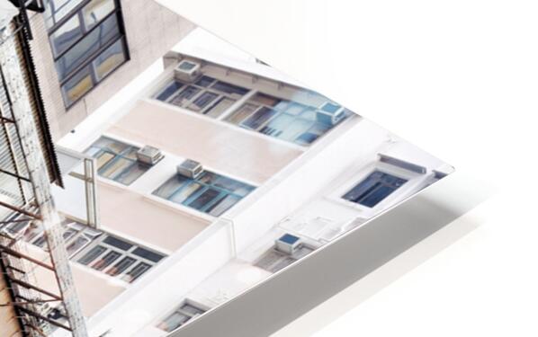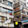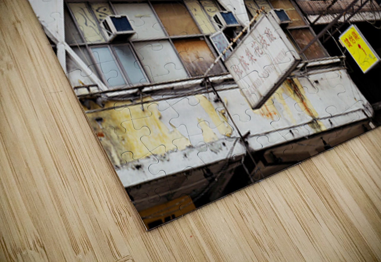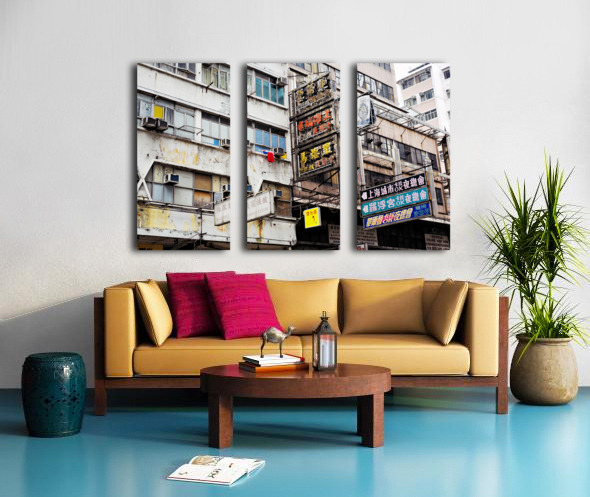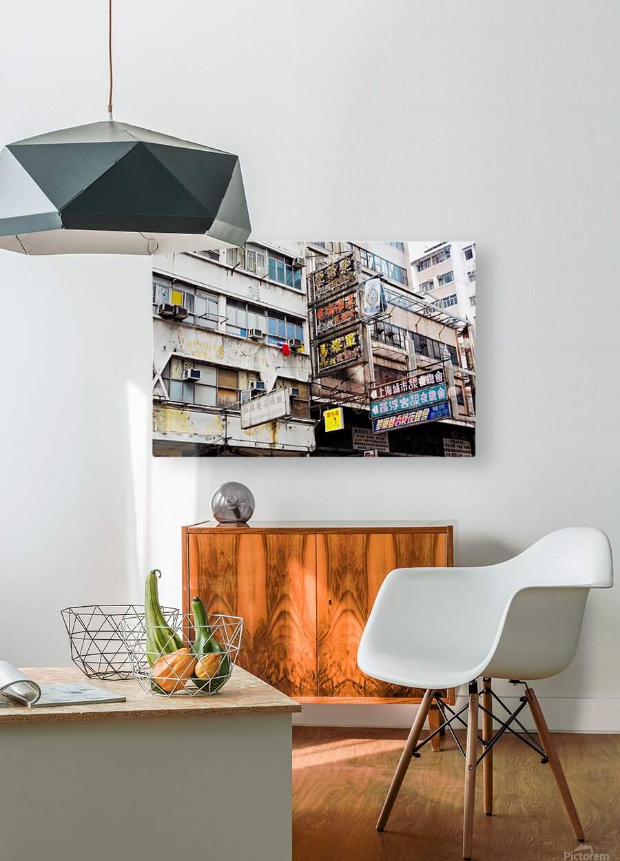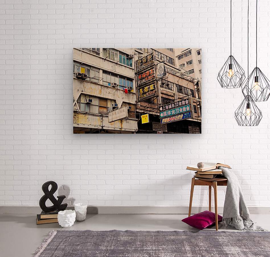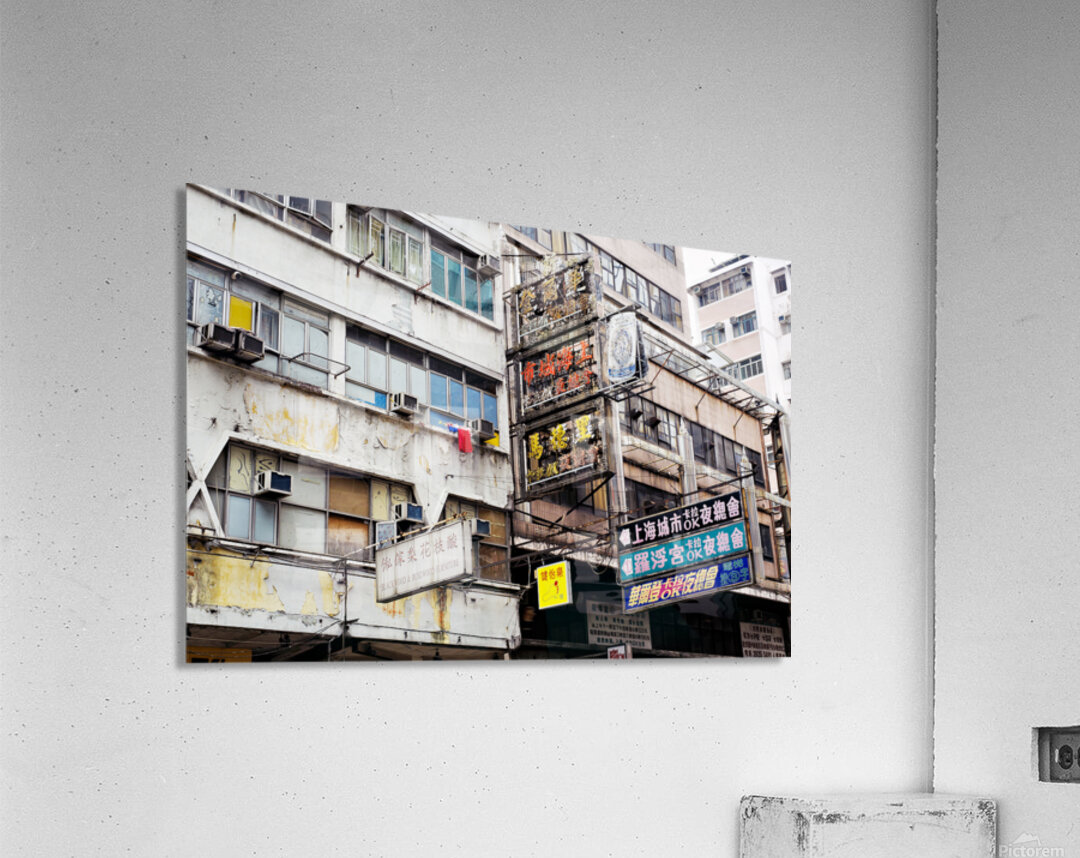 Buildings in Hong Kong show signs of age covered in Chinese signs and laundry hanging outside. The scene reflects daily life and culture.