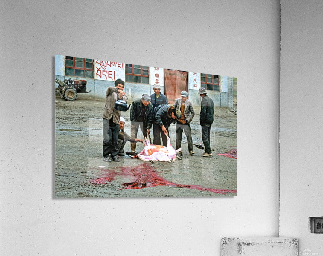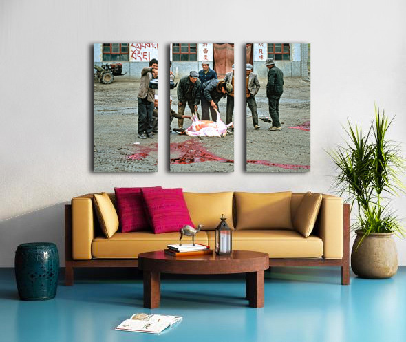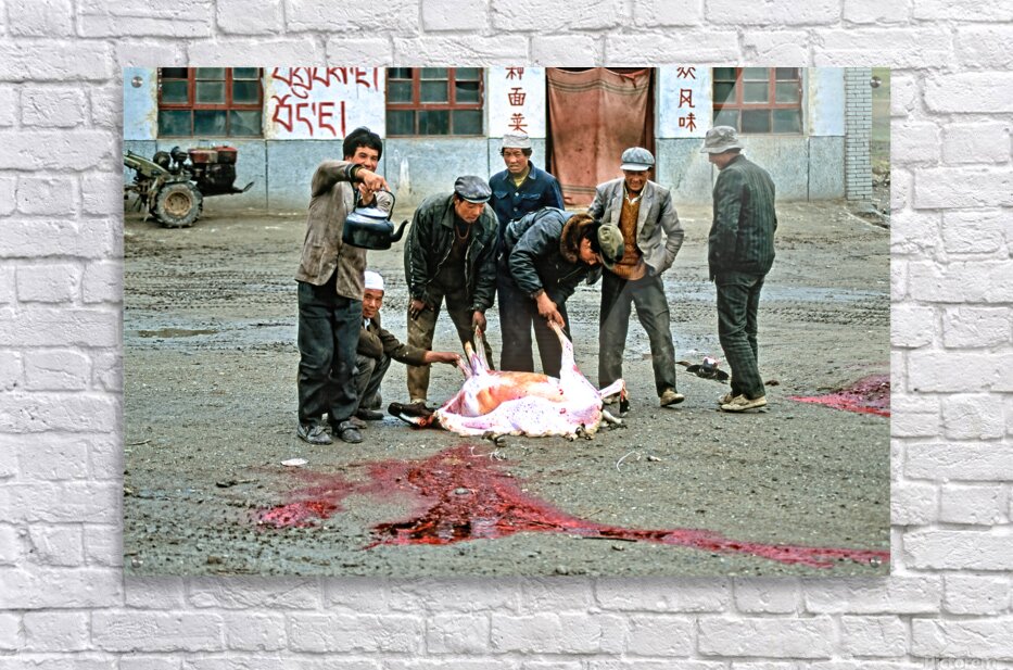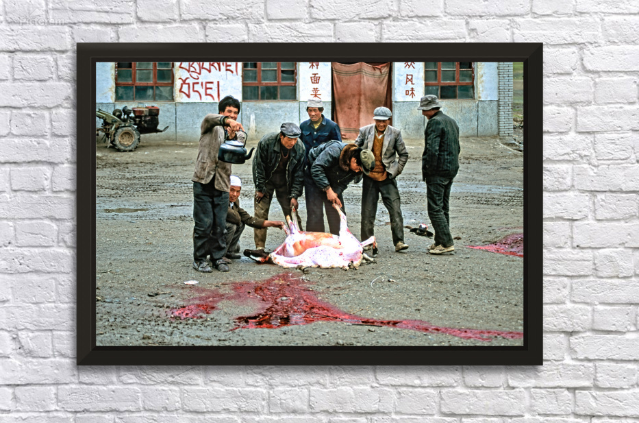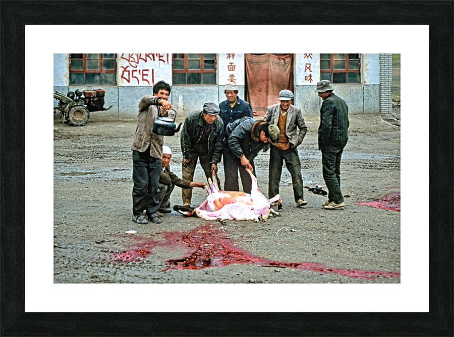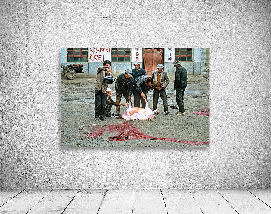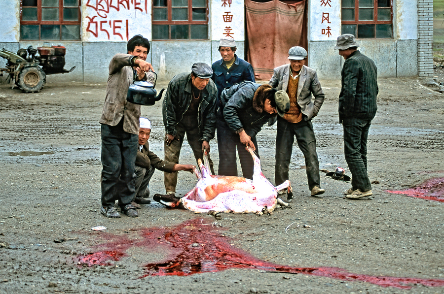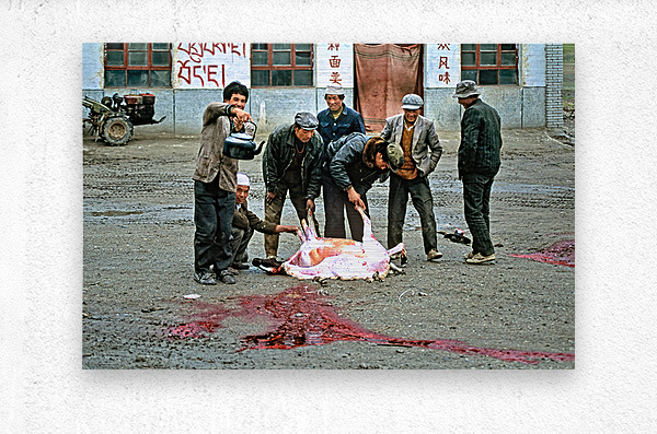 A group of men works together to butcher a sheep in Tibet. They carefully handle the animal in a dirt area near buildings.