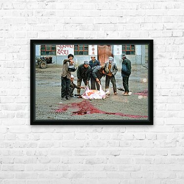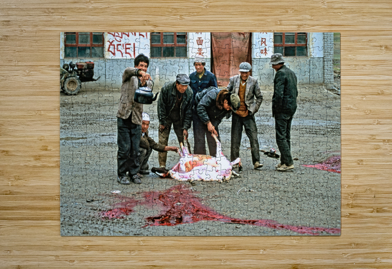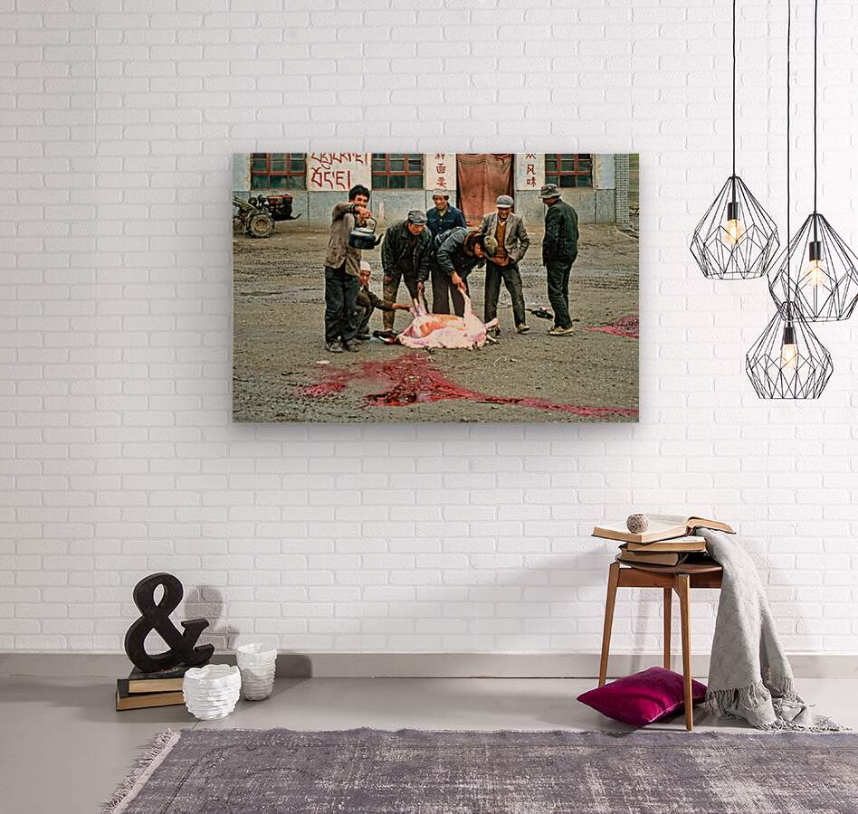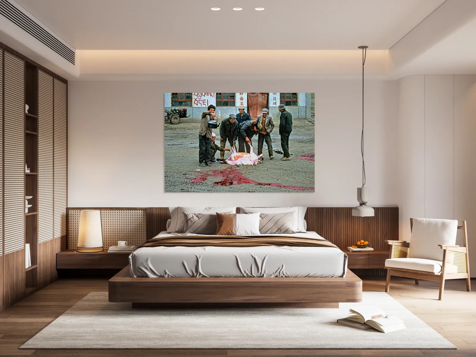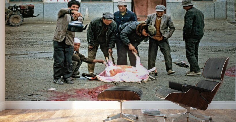 A group of men works together to butcher a sheep in Tibet. They carefully handle the animal in a dirt area near buildings.