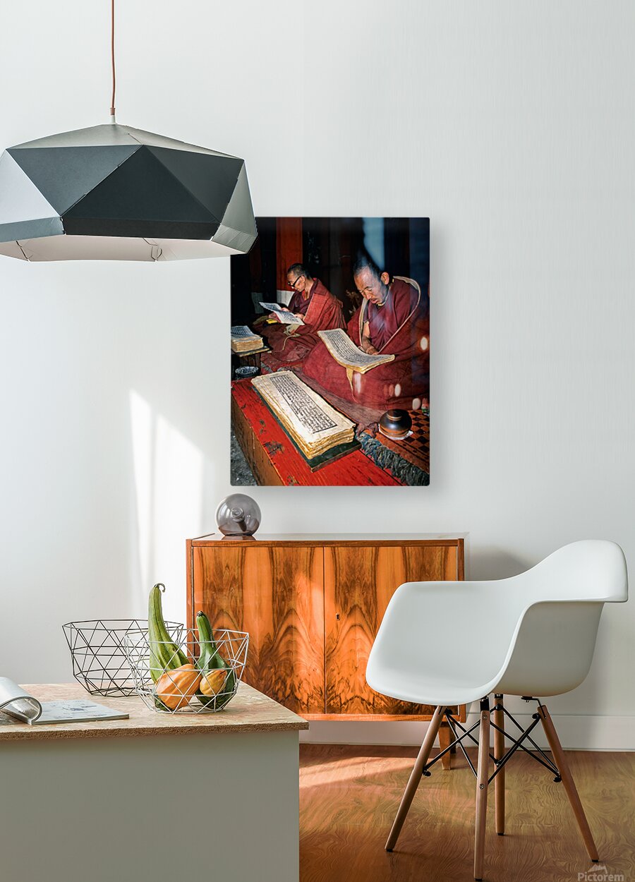 ABOUT THIS ARTWORK: MONKS READ SACRED TEXTS IN A TIBETAN TEMPLE AT NIGHT