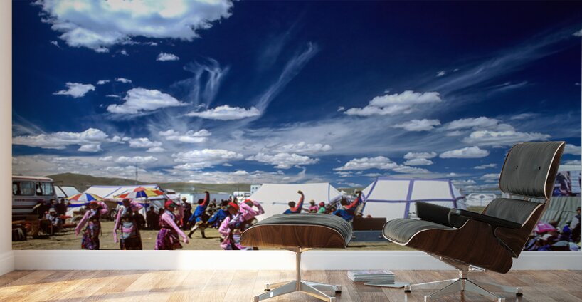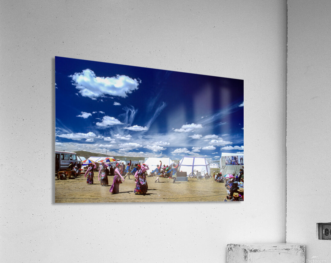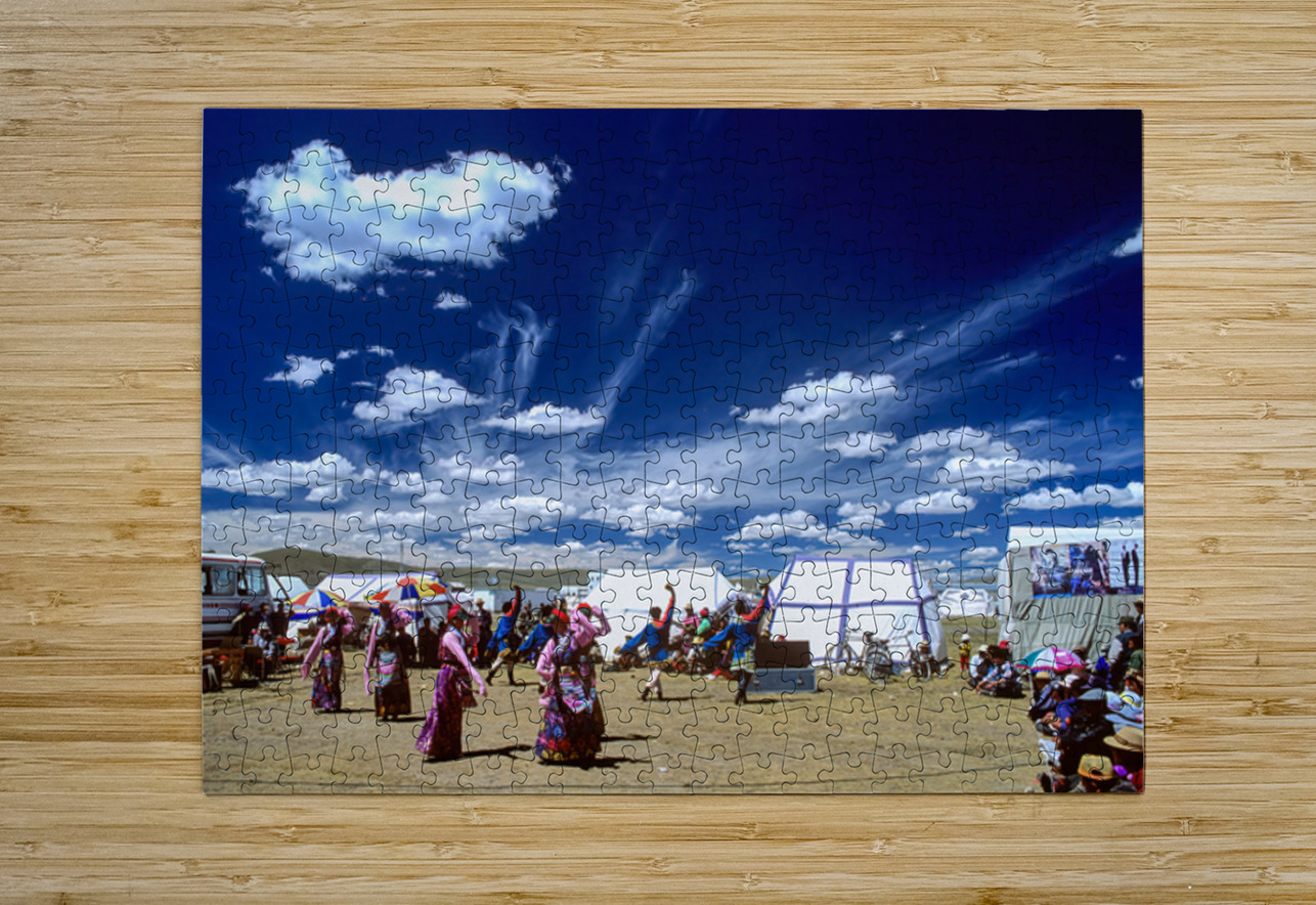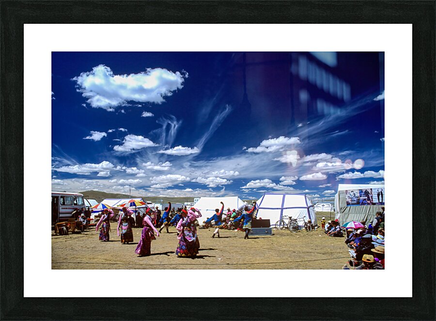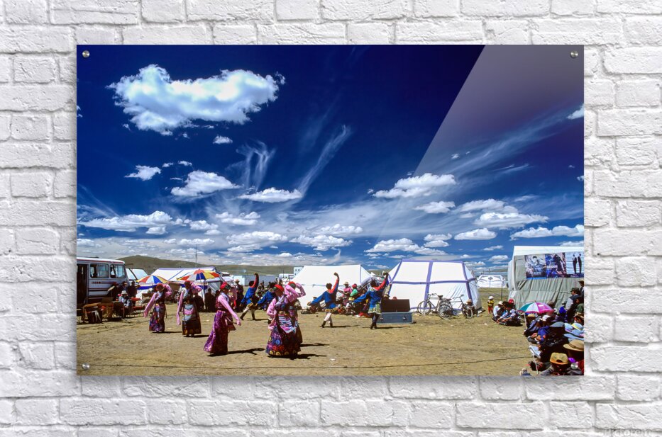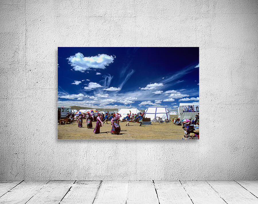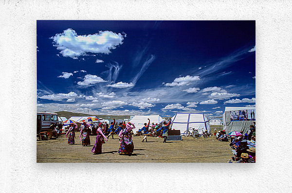 People are dancing during an outdoor festival in Tibet. Tents are set up around the area. The sky is clear and bright.