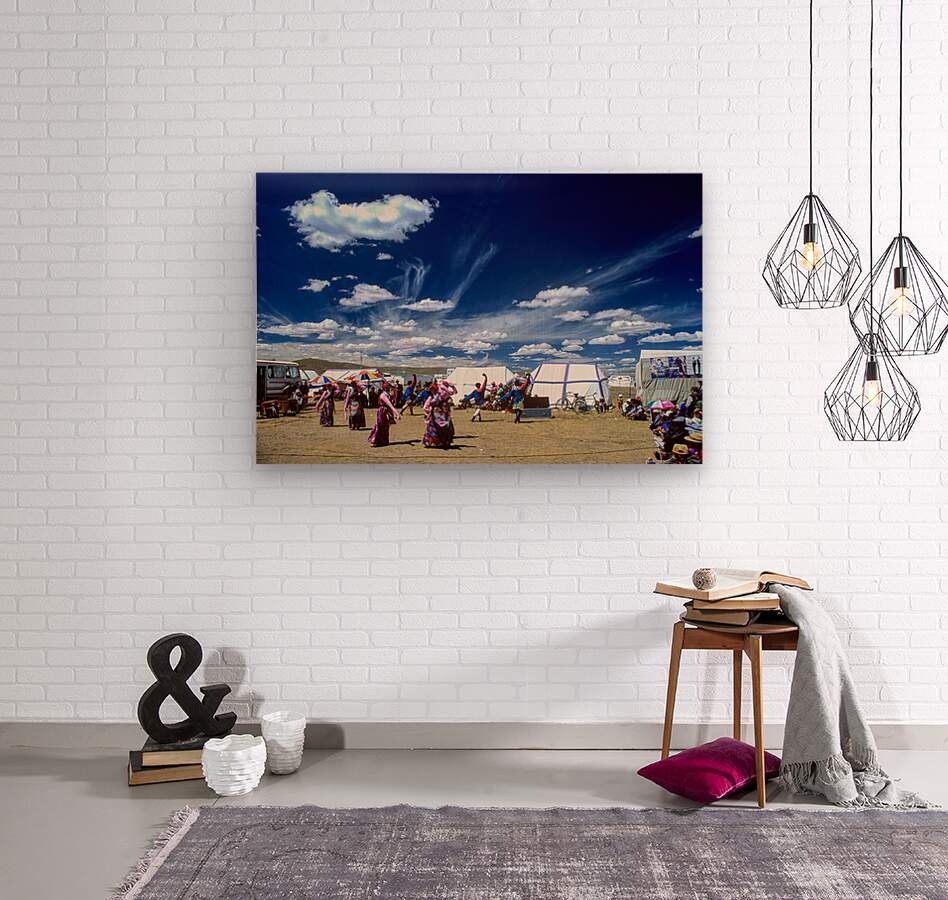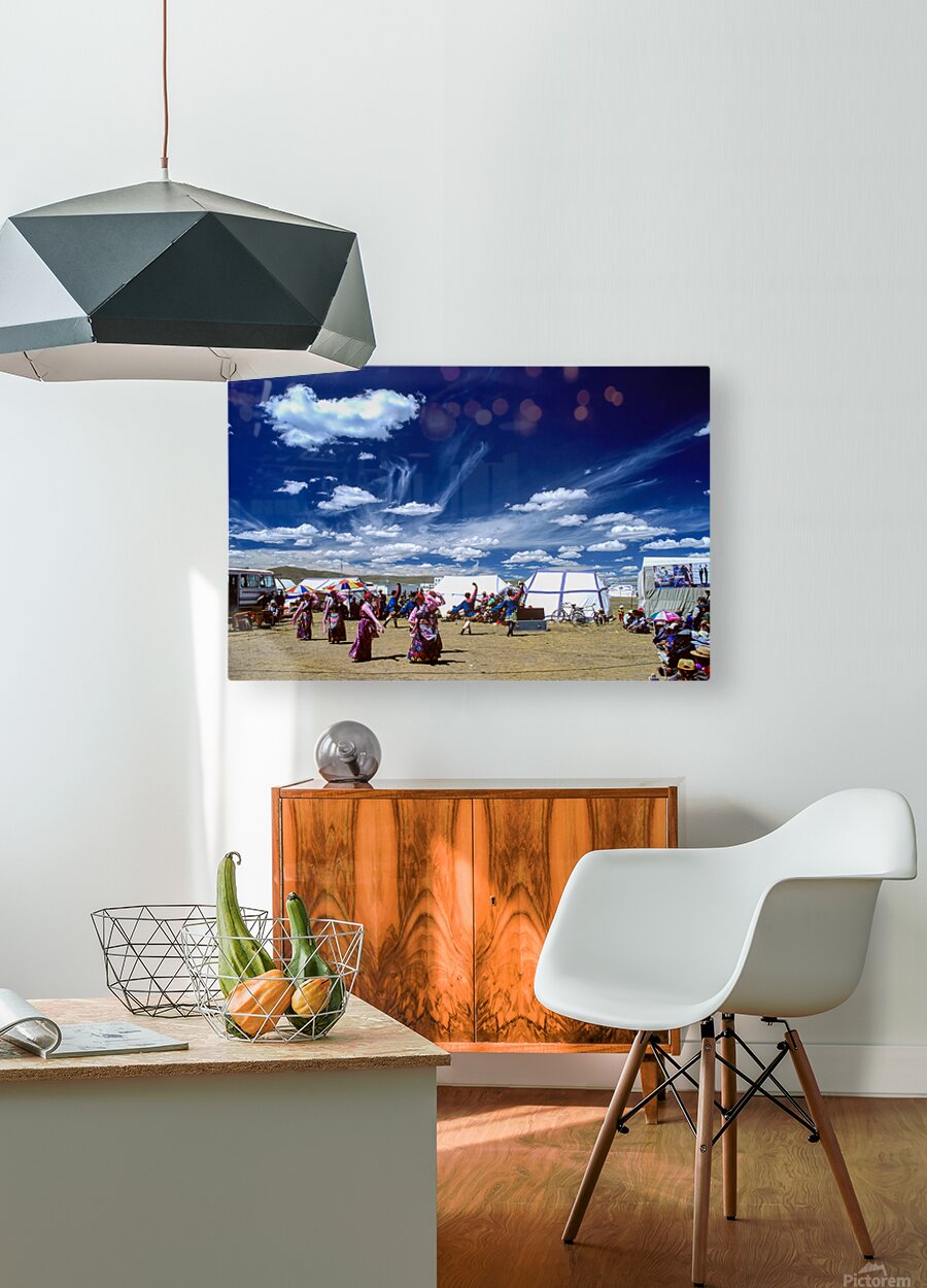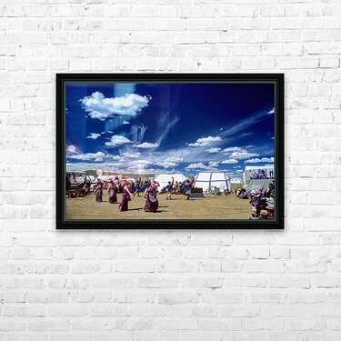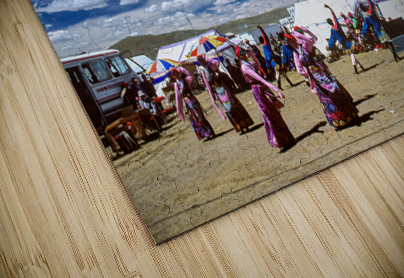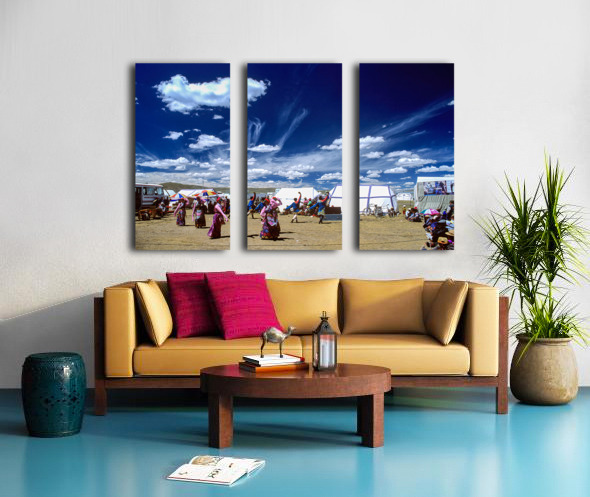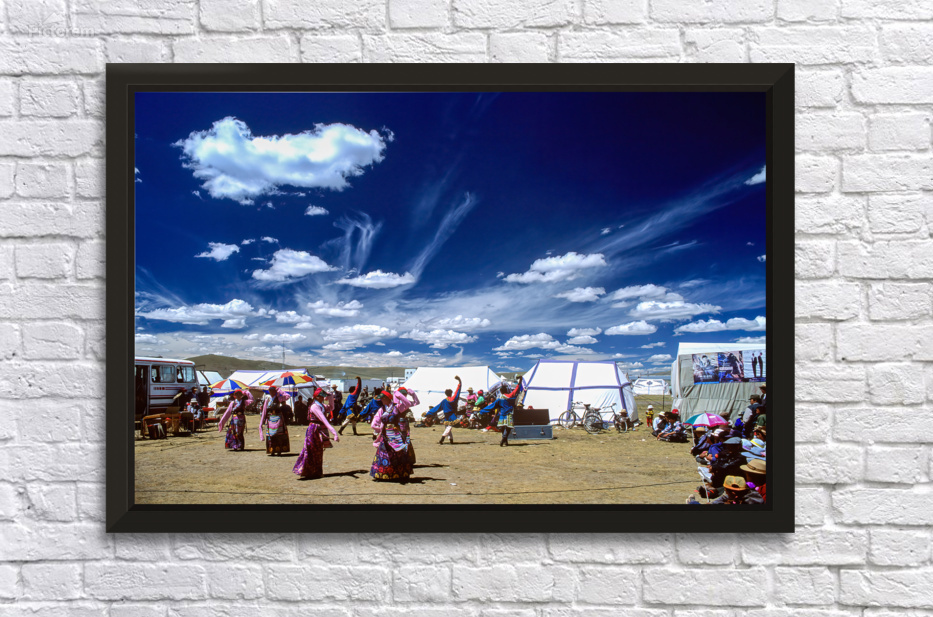 People are dancing during an outdoor festival in Tibet. Tents are set up around the area. The sky is clear and bright.