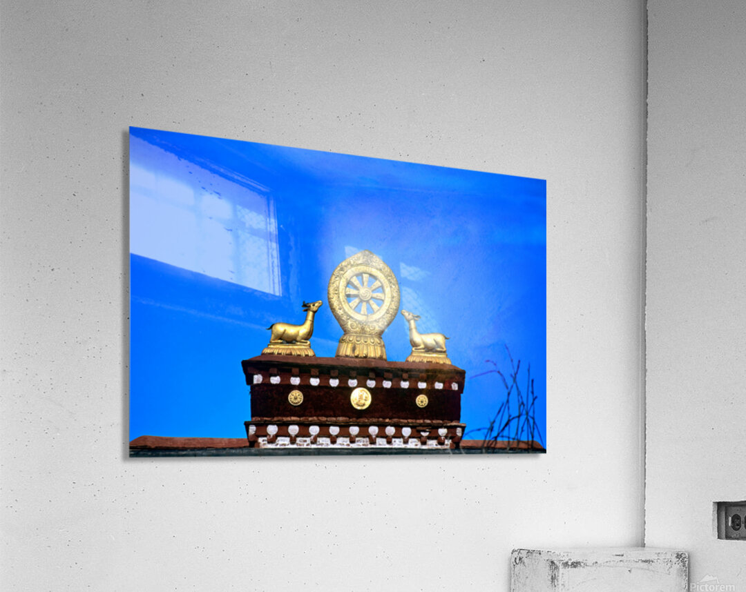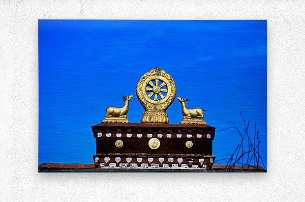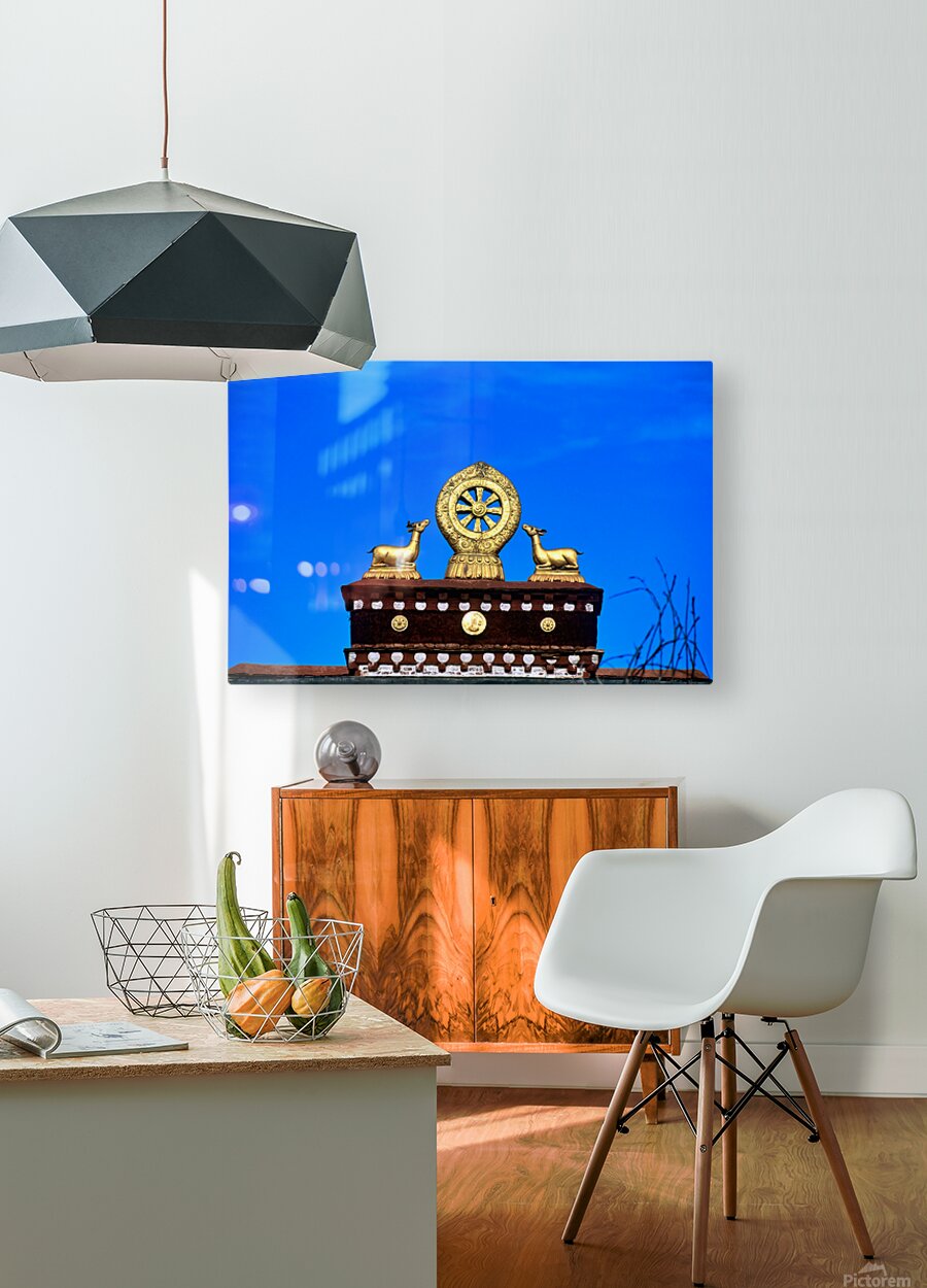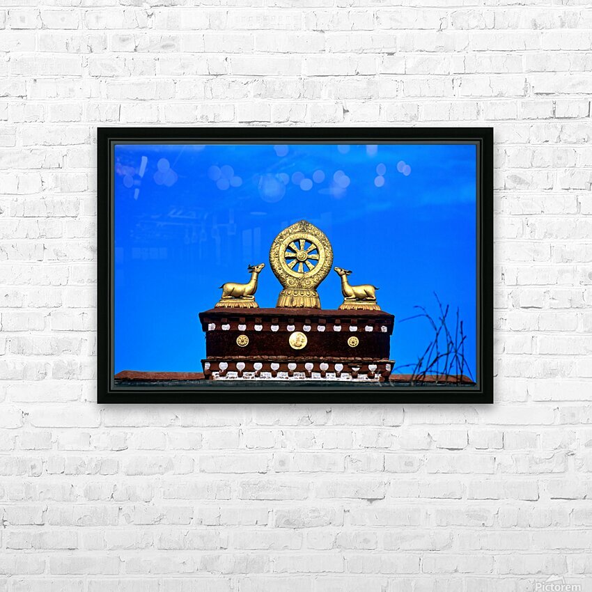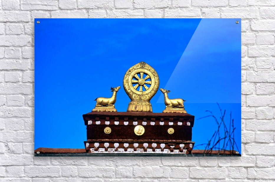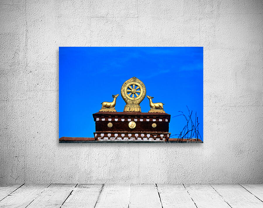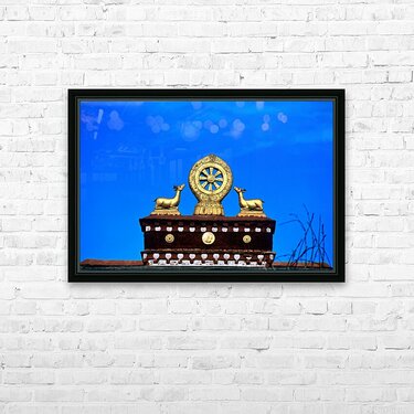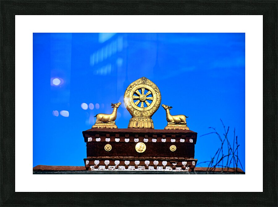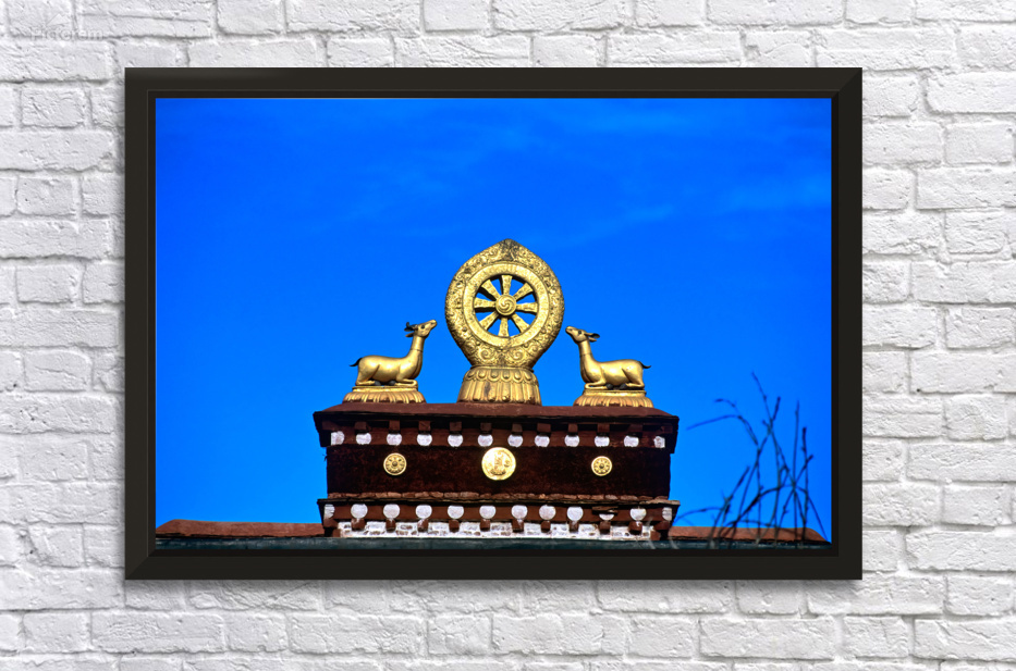 "Golden Dharma wheel and deer statues on temple roof in Tibet" in a framed print.