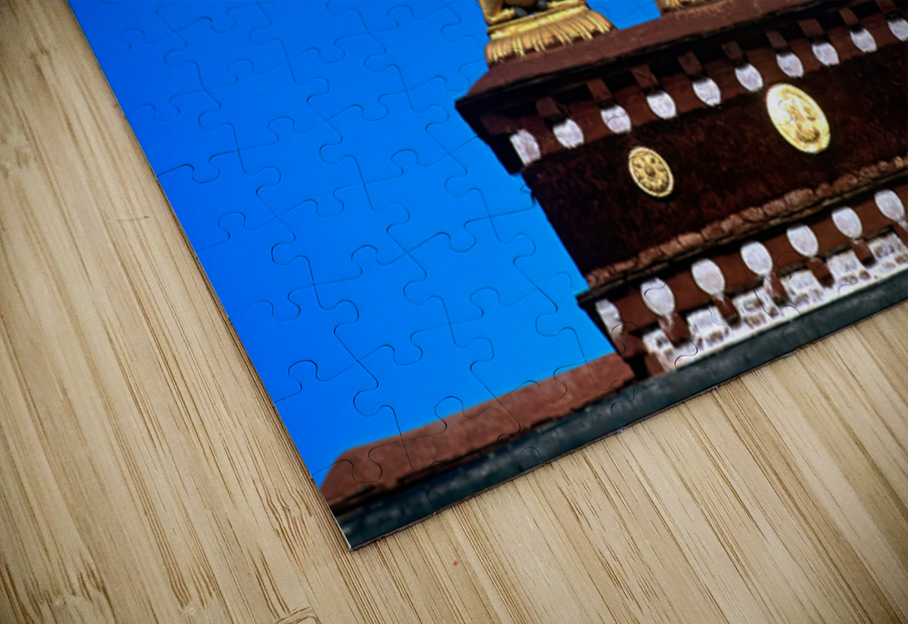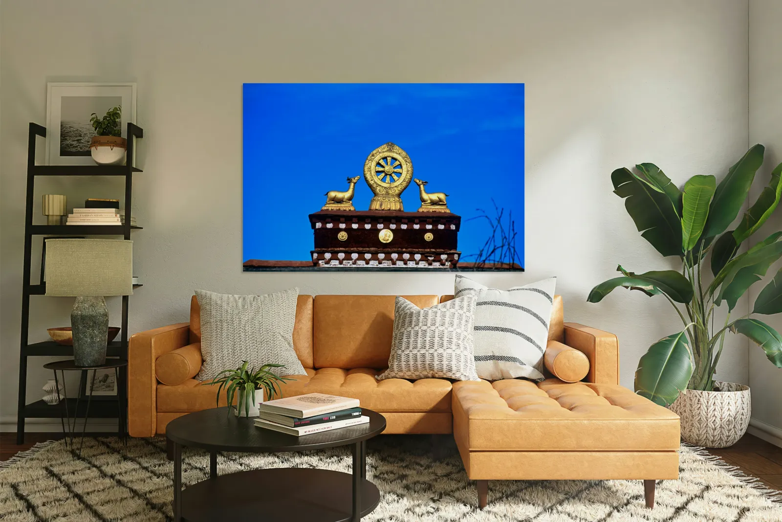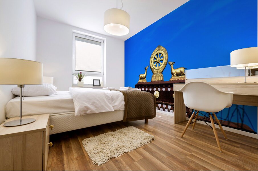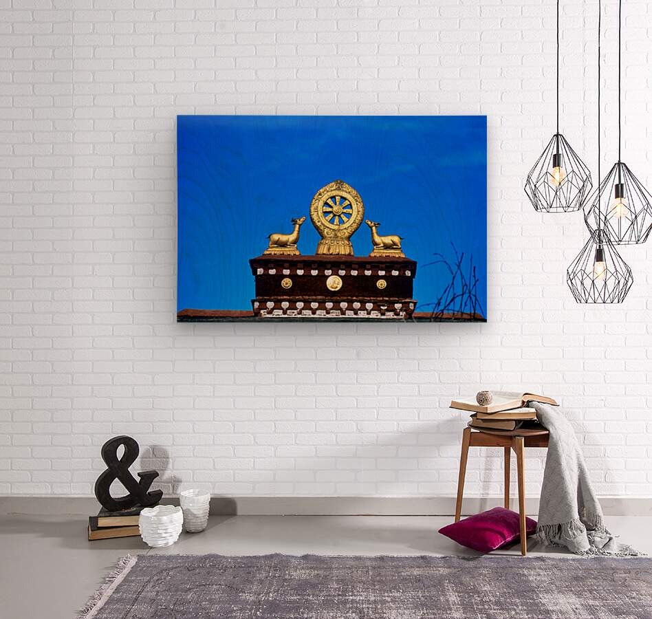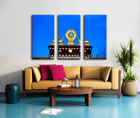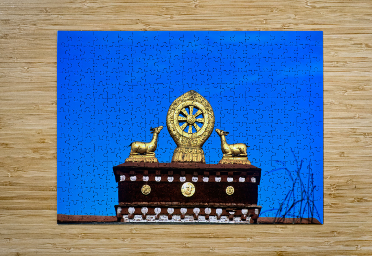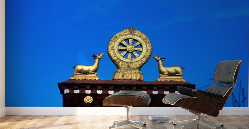"Golden Dharma wheel and deer statues on temple roof in Tibet" in a framed print.