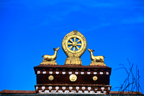 A golden Dharma wheel sits above two deer statues on a temple roof in Tibet. The blue sky serves as a bright backdrop for this scene.