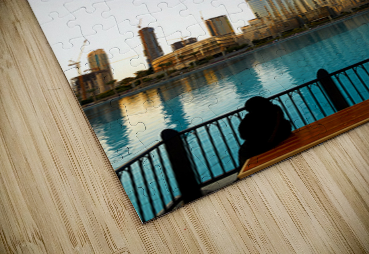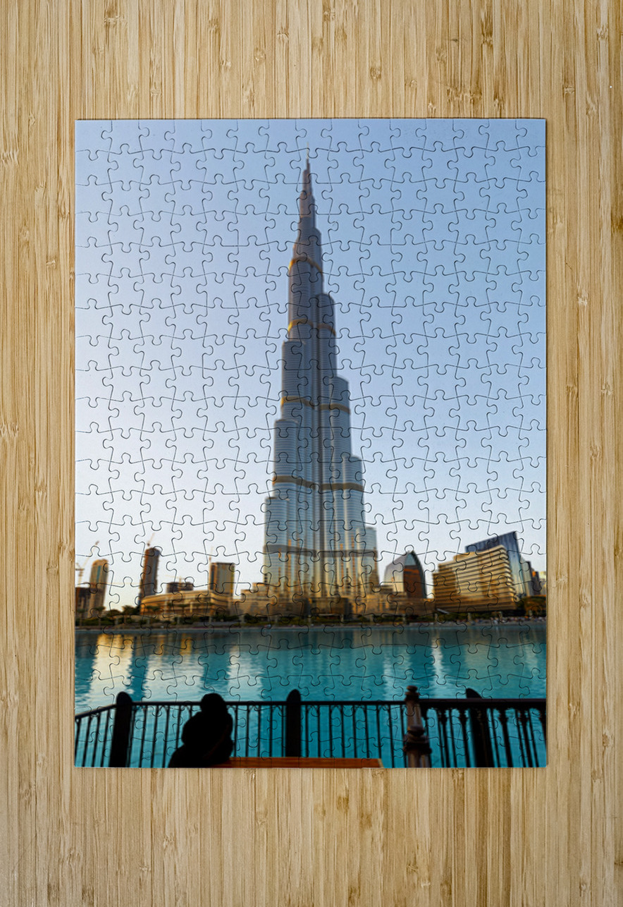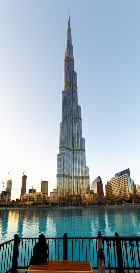 Burj Khalifa stands tall reflected in the water as the sun sets in Dubai. The city skyline and buildings surround the famous tower.