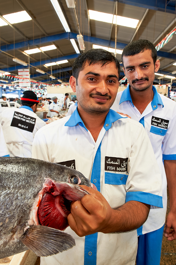 SMILING FISHMONGERS HOLD FRESH FISH AT MARKET IN DUBAI UAE