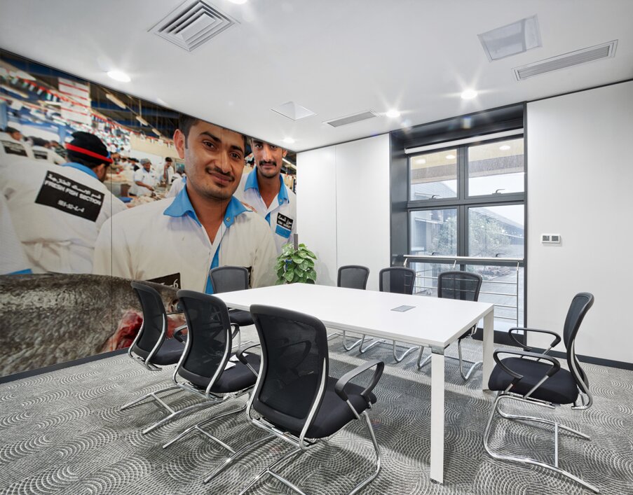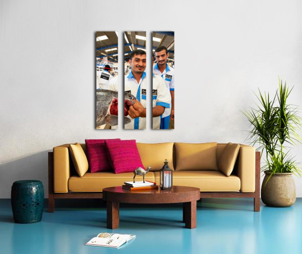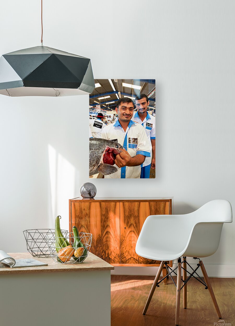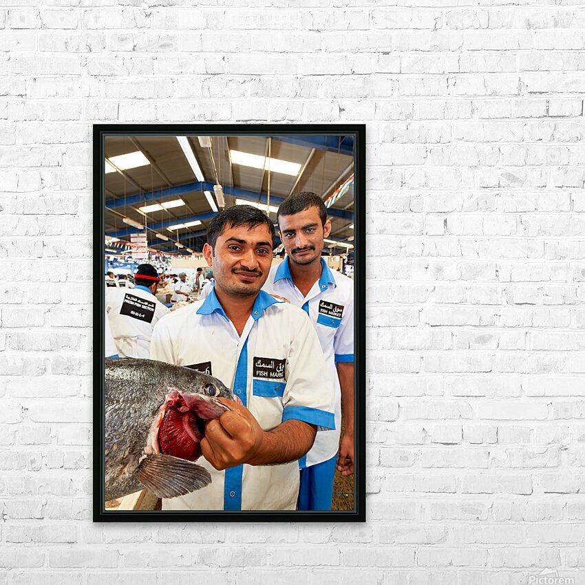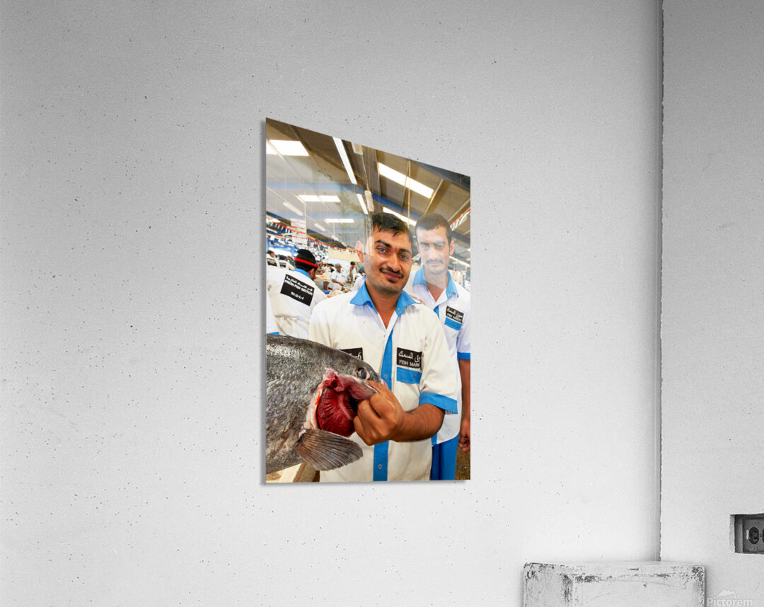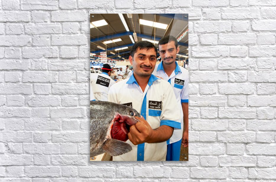Get this artwork "Smiling fishmongers hold fresh fish at market in Dubai UAE" in a framed print.
