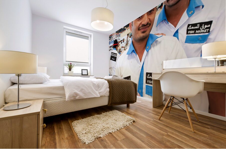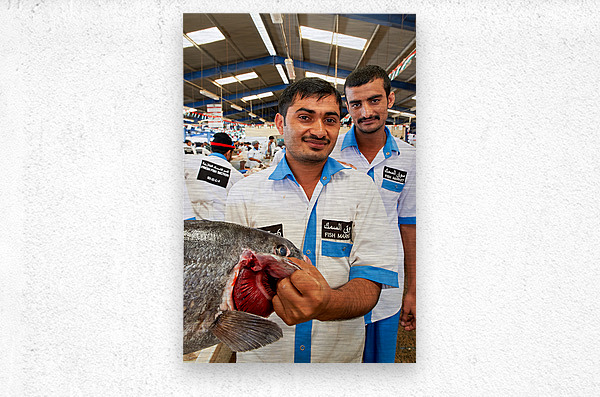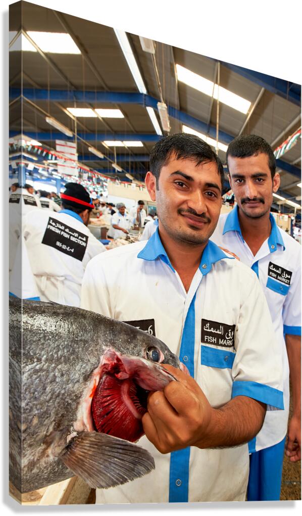 ABOUT THIS ARTWORK: SMILING FISHMONGERS HOLD FRESH FISH AT MARKET IN DUBAI UAE