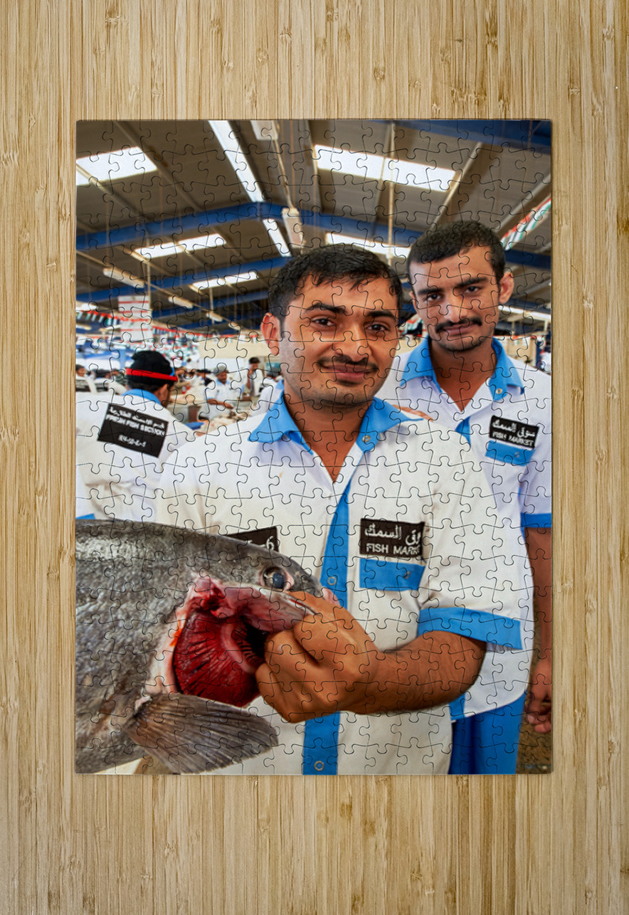 Smiling fishmongers hold fresh fish at market in Dubai UAE Marco Brivio Puzzle printing