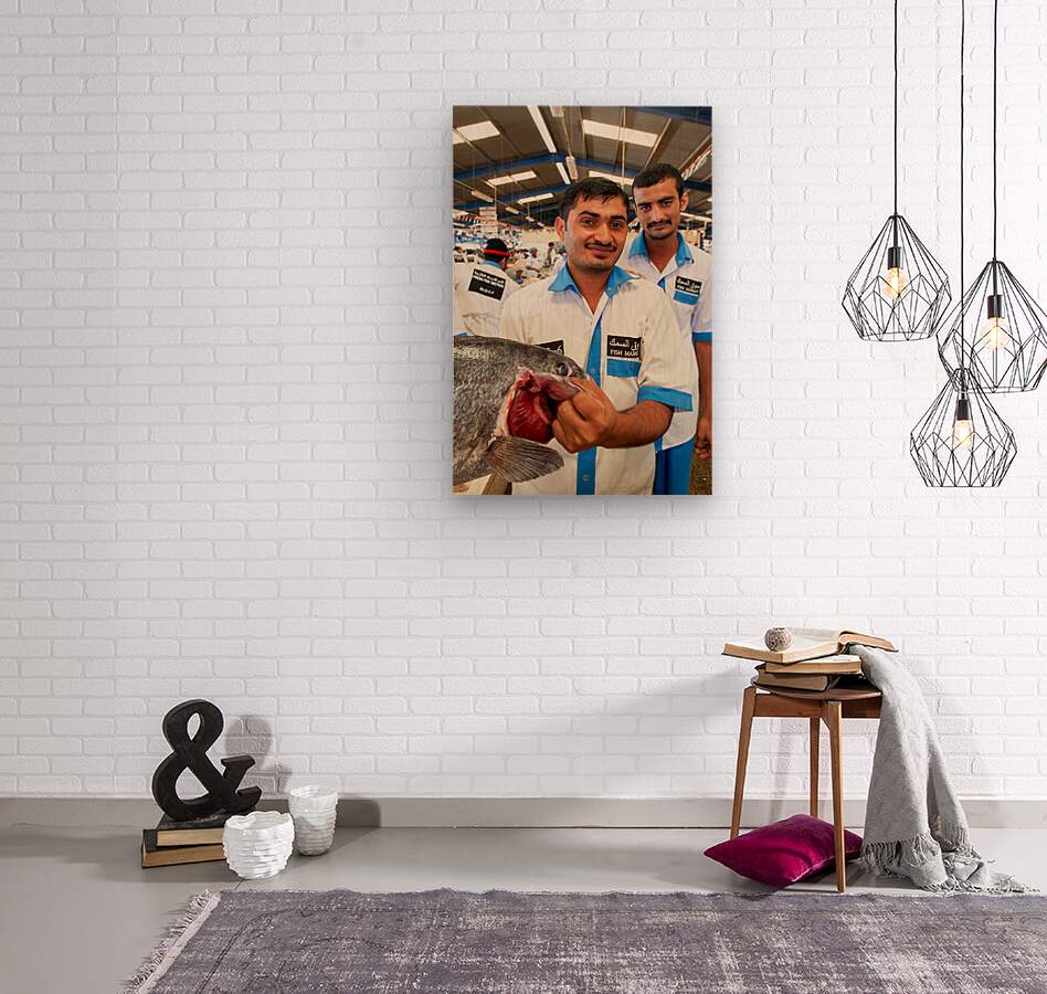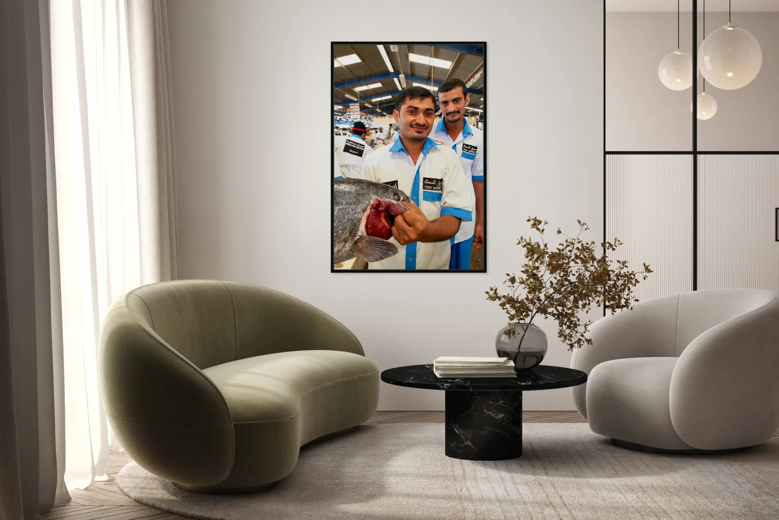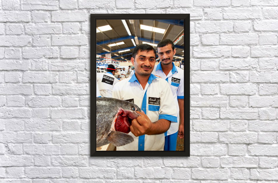 Fishmongers smile while displaying fresh seafood at the market in Dubai UAE. This busy scene captures their work and the fresh catch.
