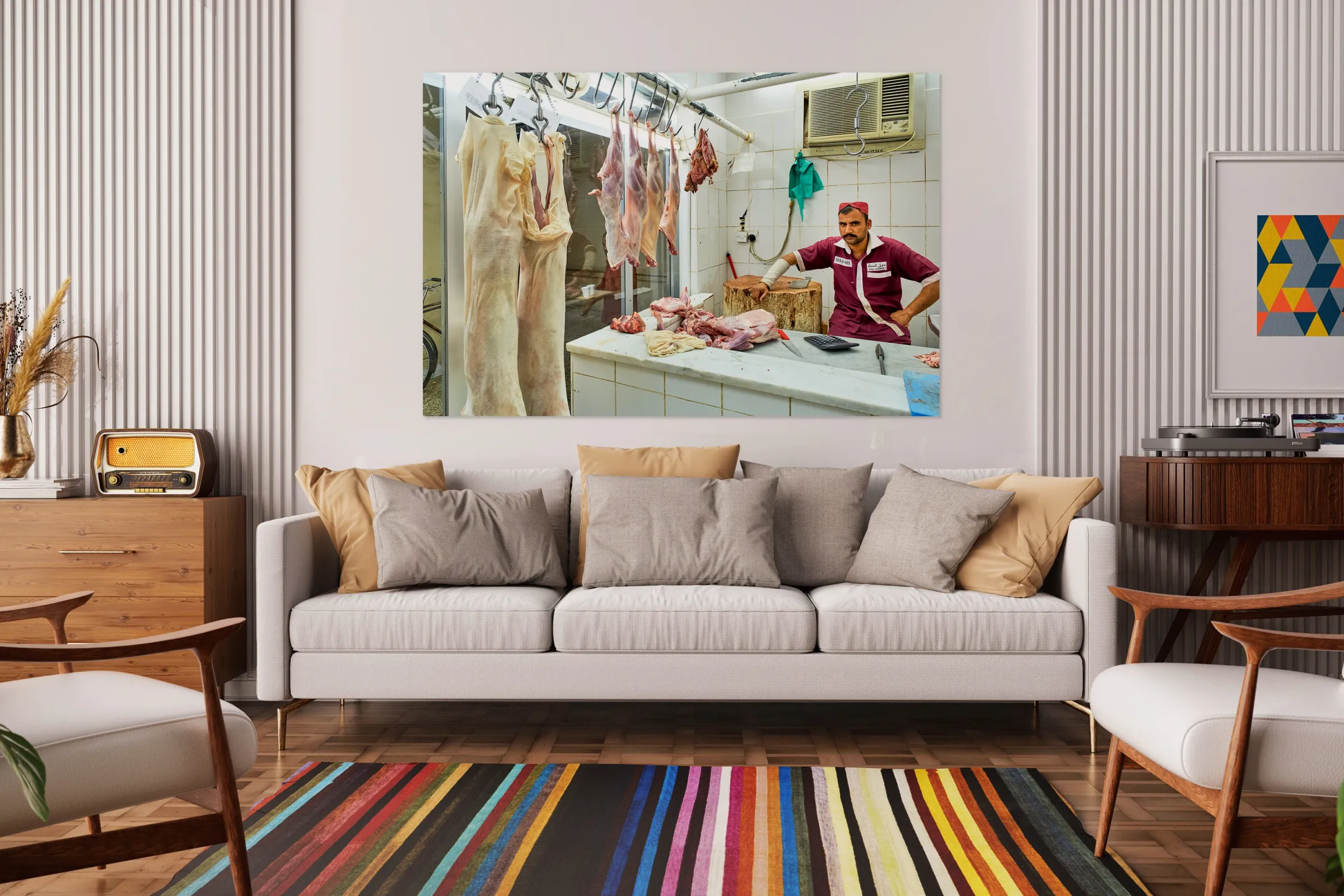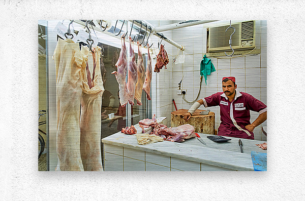 ABOUT THIS ARTWORK: BUTCHER WORKS IN MEAT MARKET IN DUBAI WITH HANGING MEAT