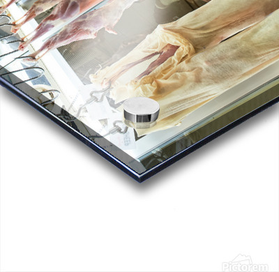 Butcher works in meat market in Dubai with hanging meat Picture Frame Printing