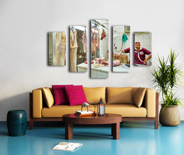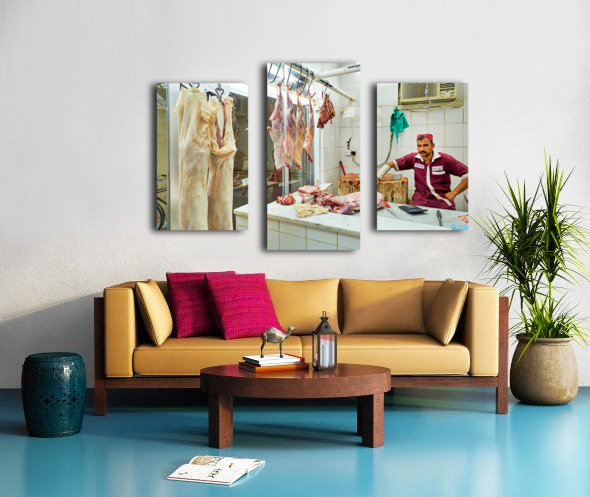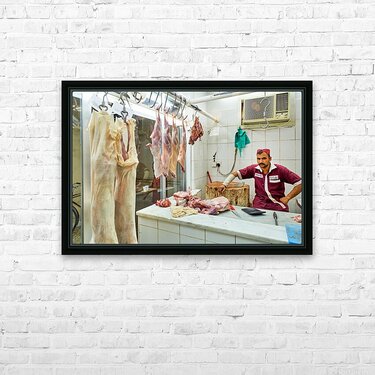 Get this artwork "Butcher works in meat market in Dubai with hanging meat" in a framed print.