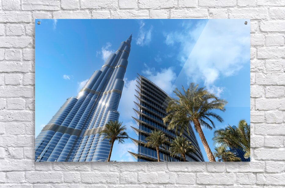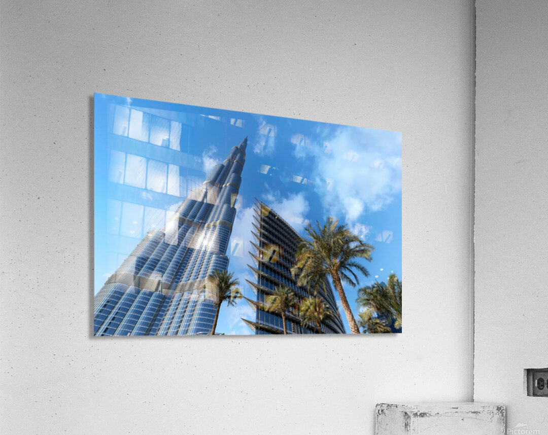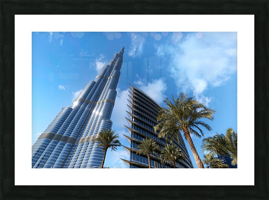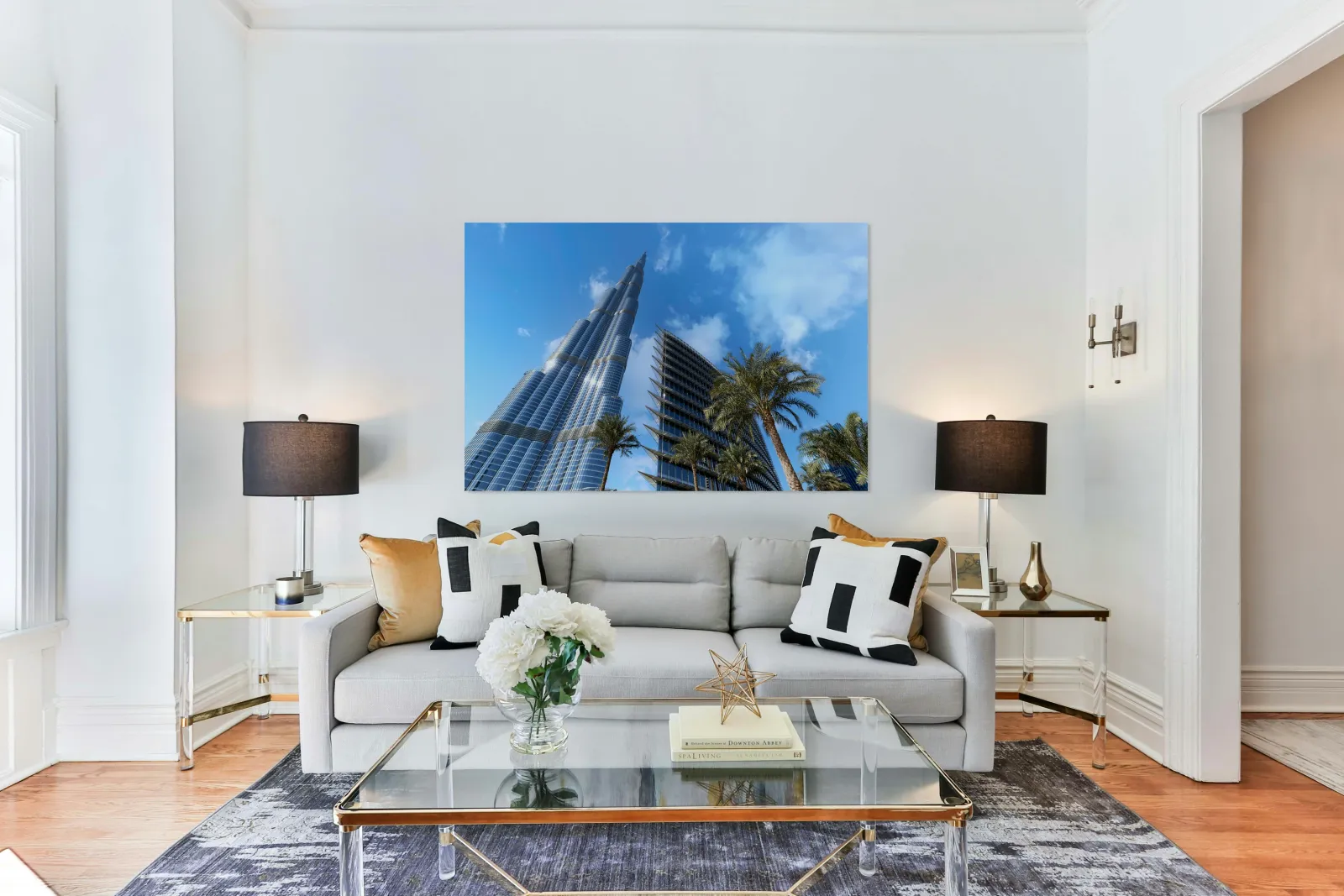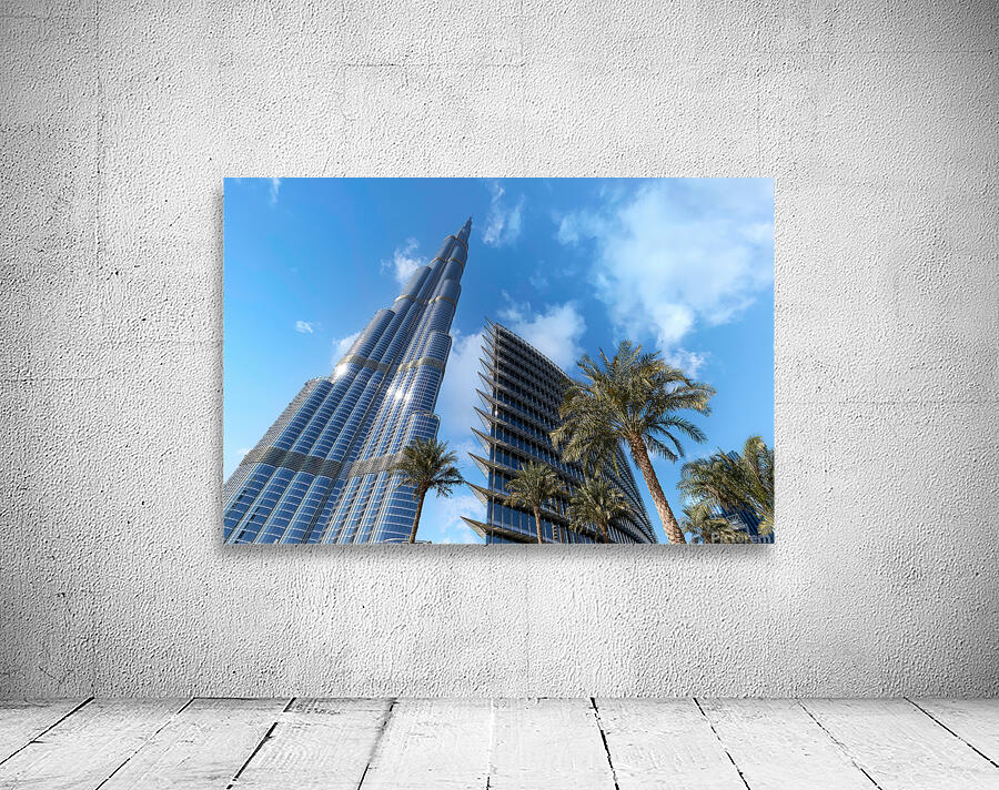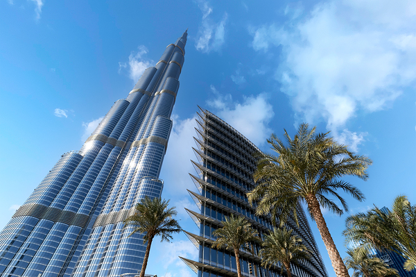 Burj Khalifa stands tall in Dubai with modern buildings and palm trees surrounding it under a clear blue sky.