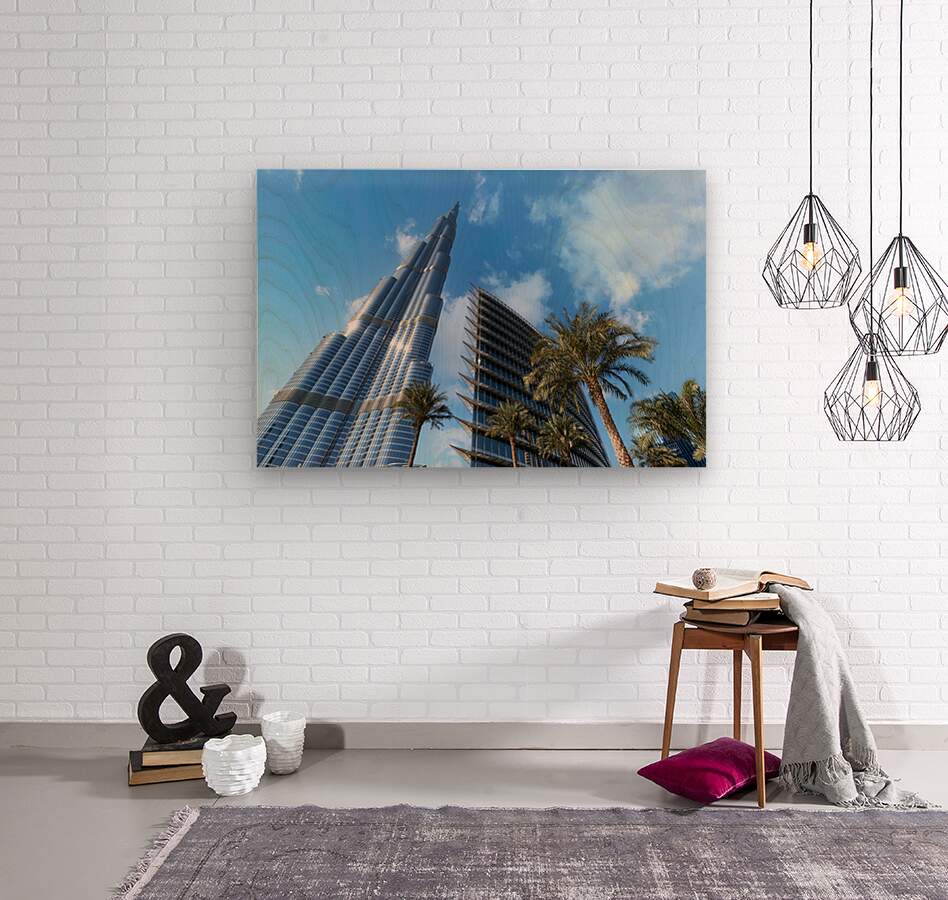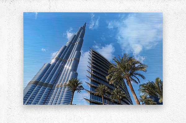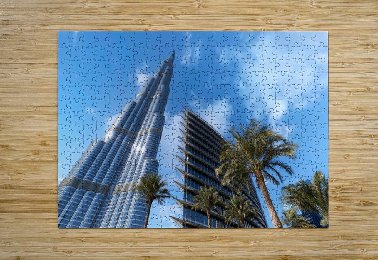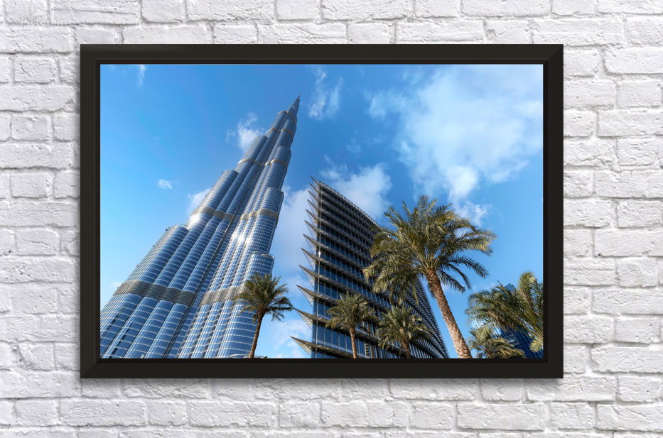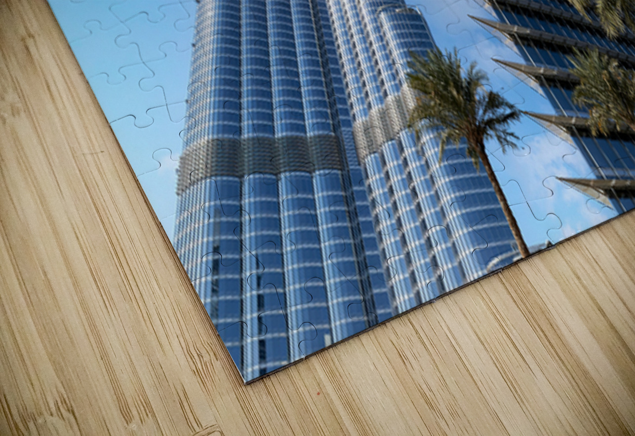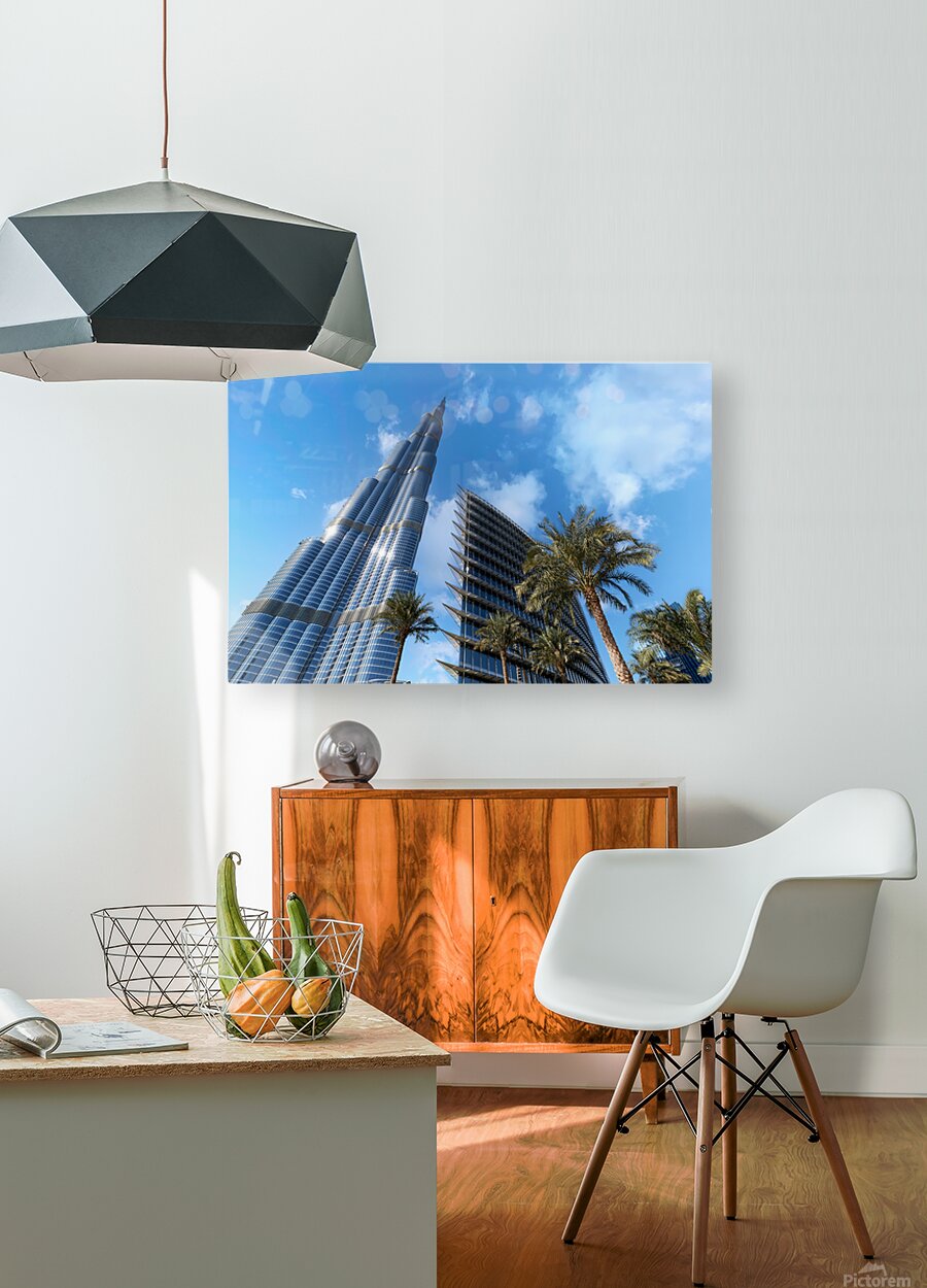 Burj Khalifa stands tall in Dubai with modern buildings and palm trees surrounding it under a clear blue sky.