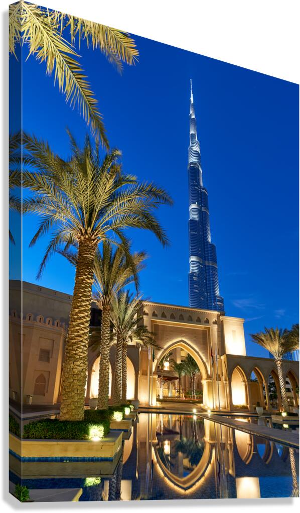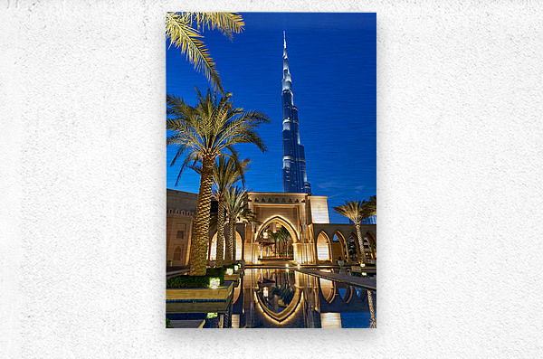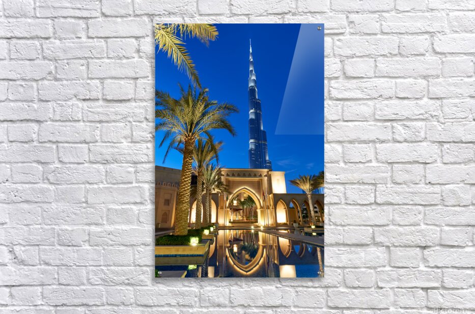 ABOUT THIS ARTWORK: BURJ KHALIFA STANDS TALL AT NIGHT WITH LIGHT REFLECTIONS IN DUBA