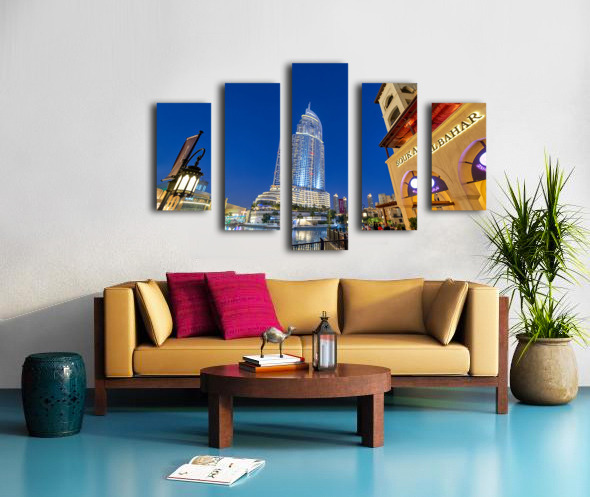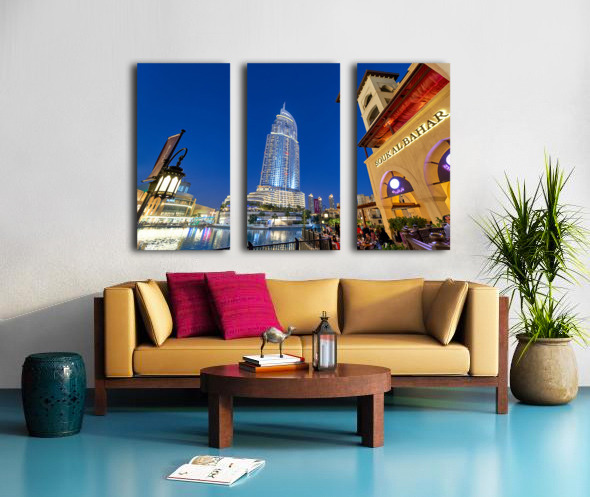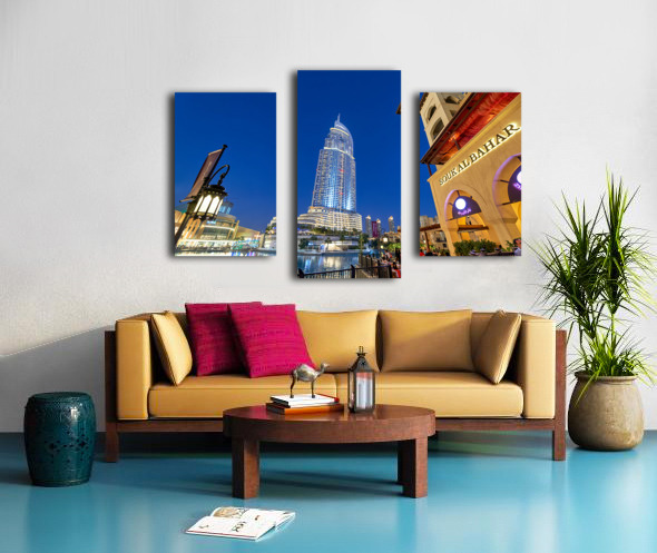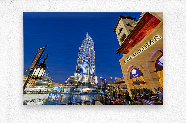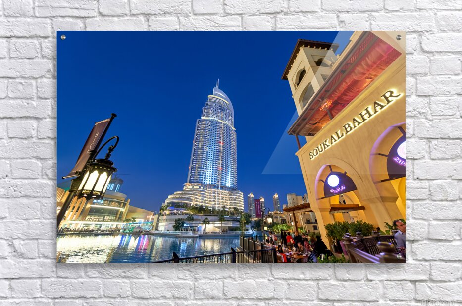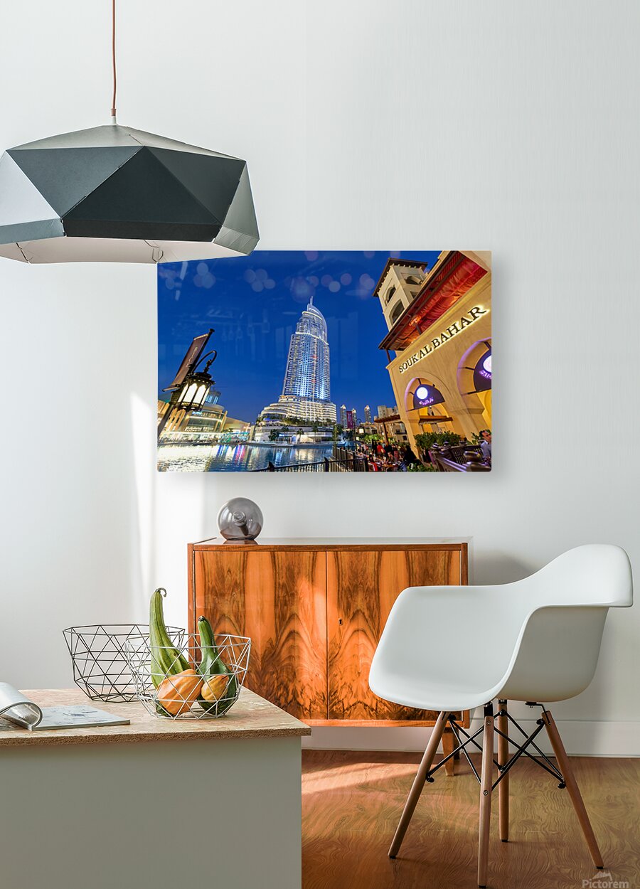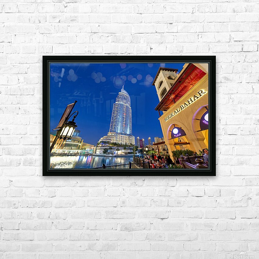 Get this artwork "Night lights and waterfront dining in Dubai cityscape" in a framed print.