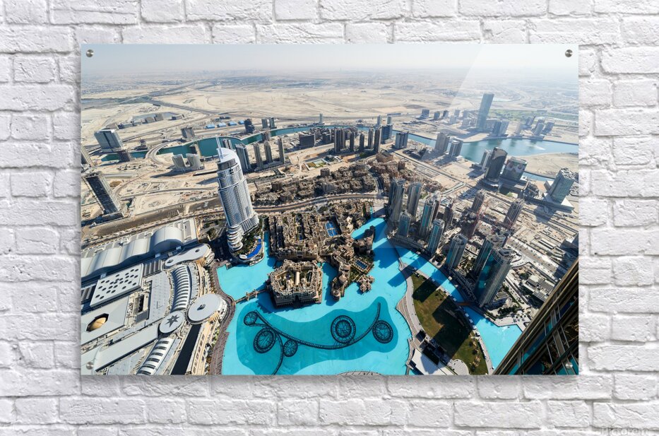 Get this artwork "Skyline view of Dubai with skyscrapers and artificial lake" in a framed print.