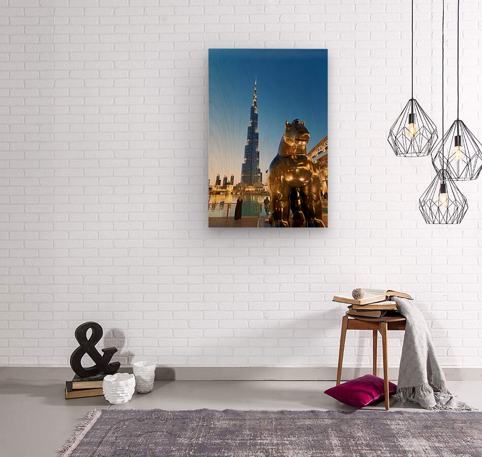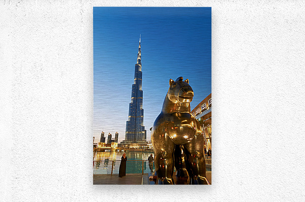 ABOUT THIS ARTWORK: BURJ KHALIFA AND GOLDEN HORSE STATUE AT DUSK IN DUBAI