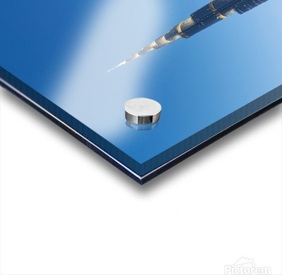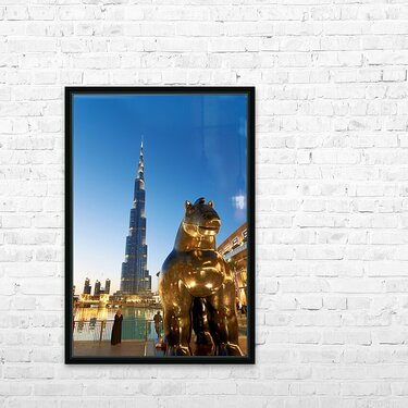Burj Khalifa and golden horse statue at dusk in Dubai Frame print