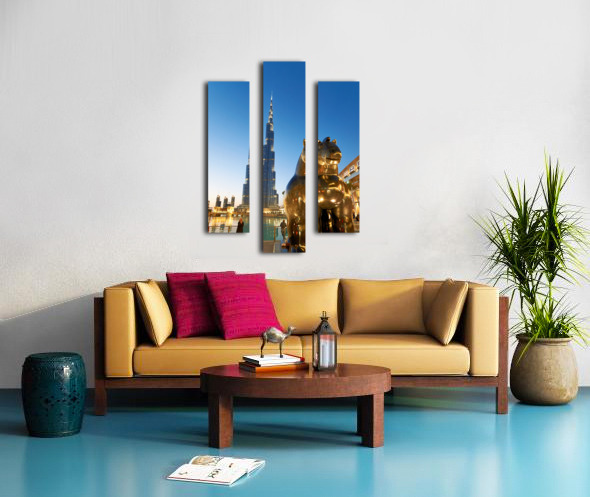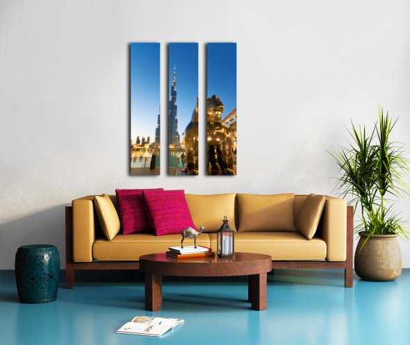 Get this artwork "Burj Khalifa and golden horse statue at dusk in Dubai" in a framed print.