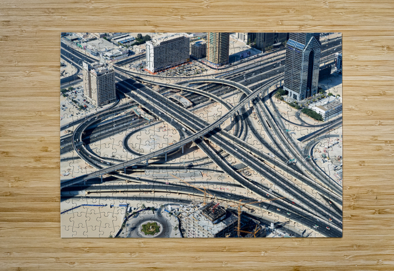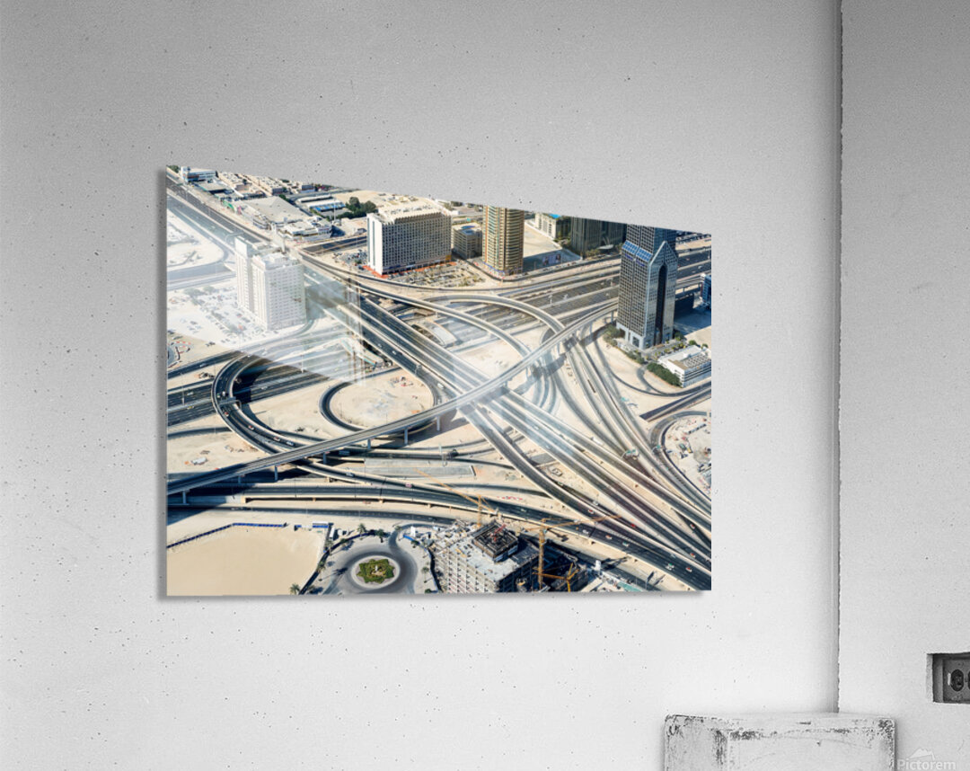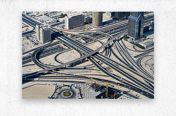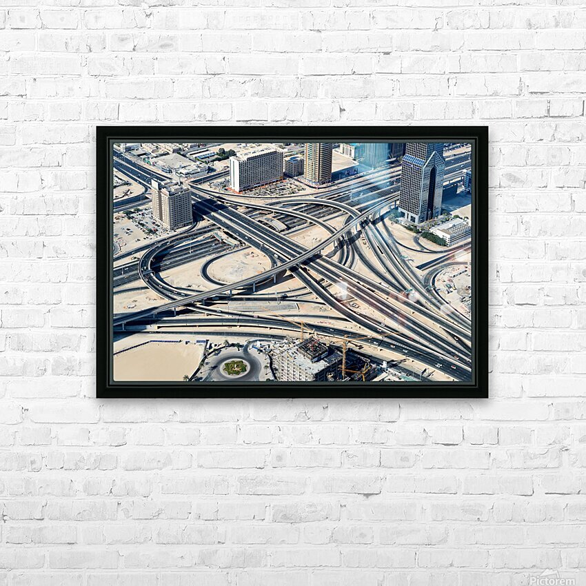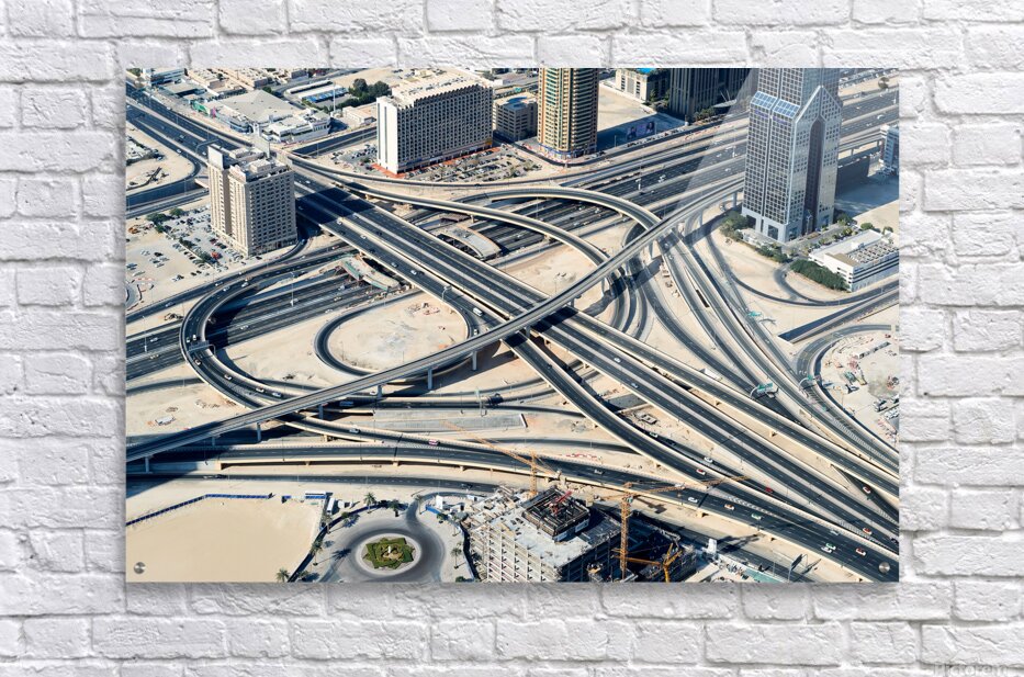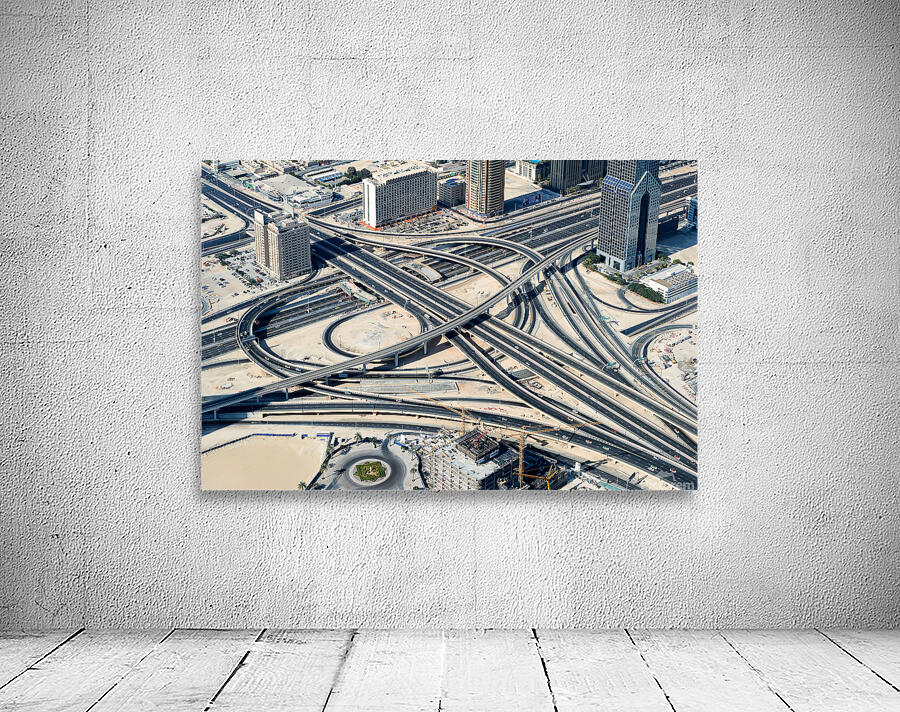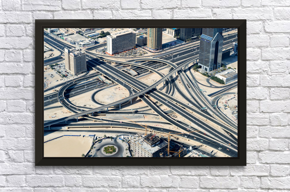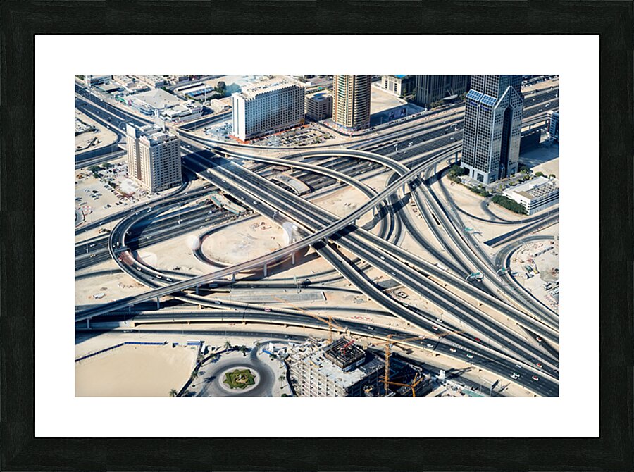 "Complex highway interchange and urban landscape in Dubai" in a framed print.