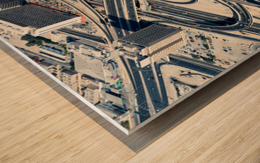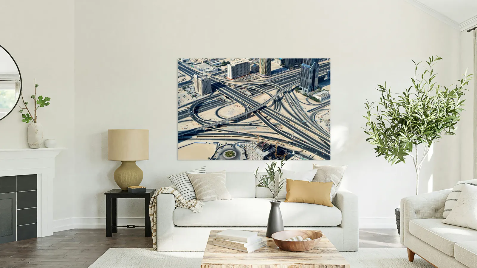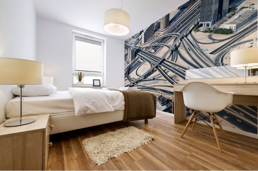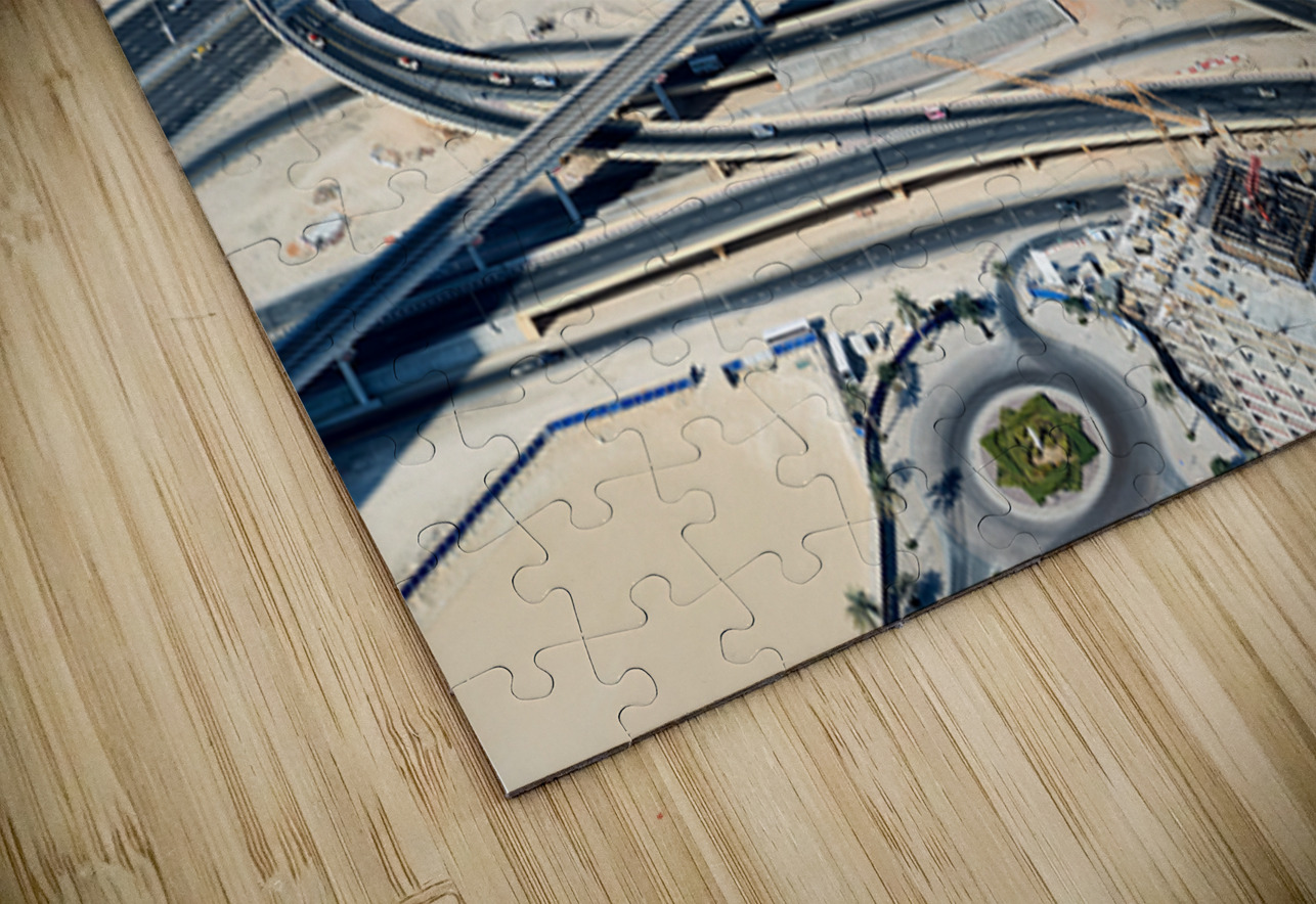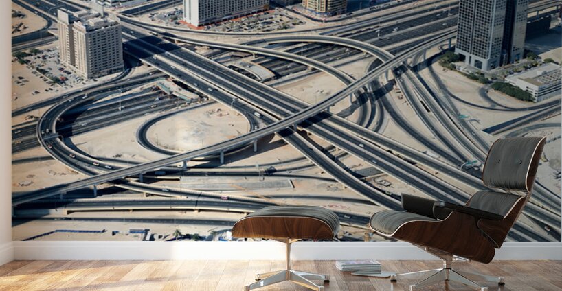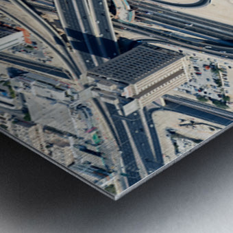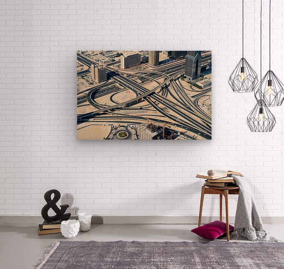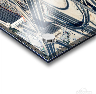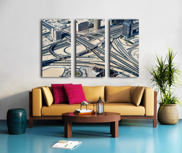 "Complex highway interchange and urban landscape in Dubai" in a framed print.