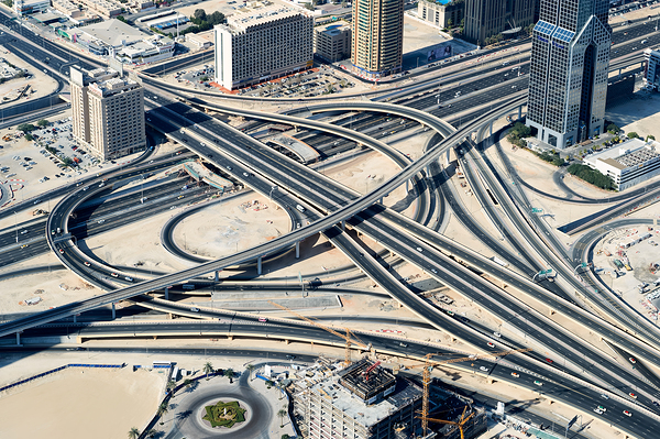 Dubais highway interchange and the surrounding urban area during daylight. Roads intersect and connect various city parts.
