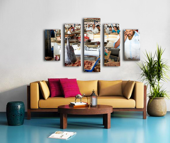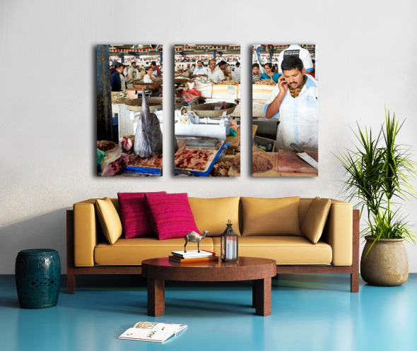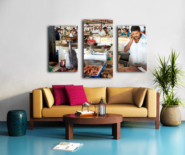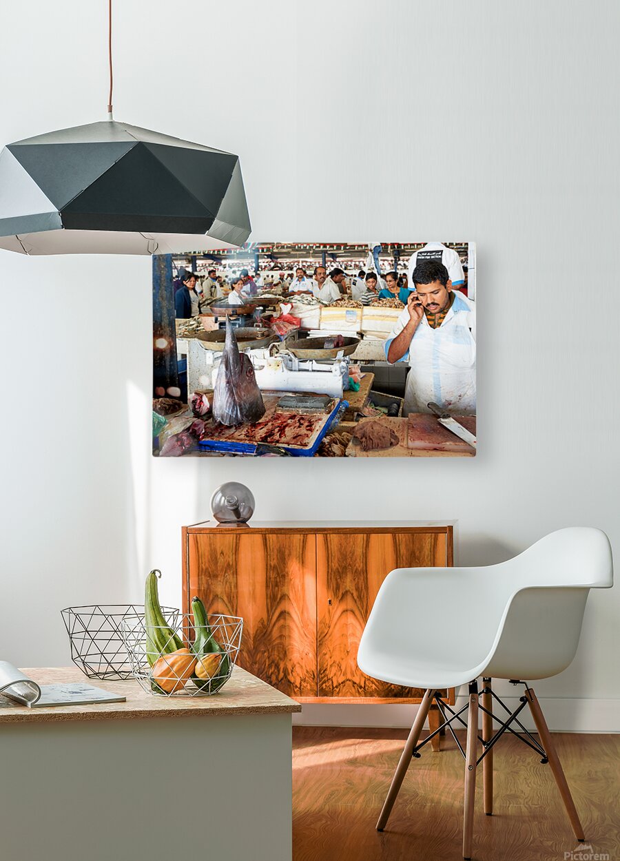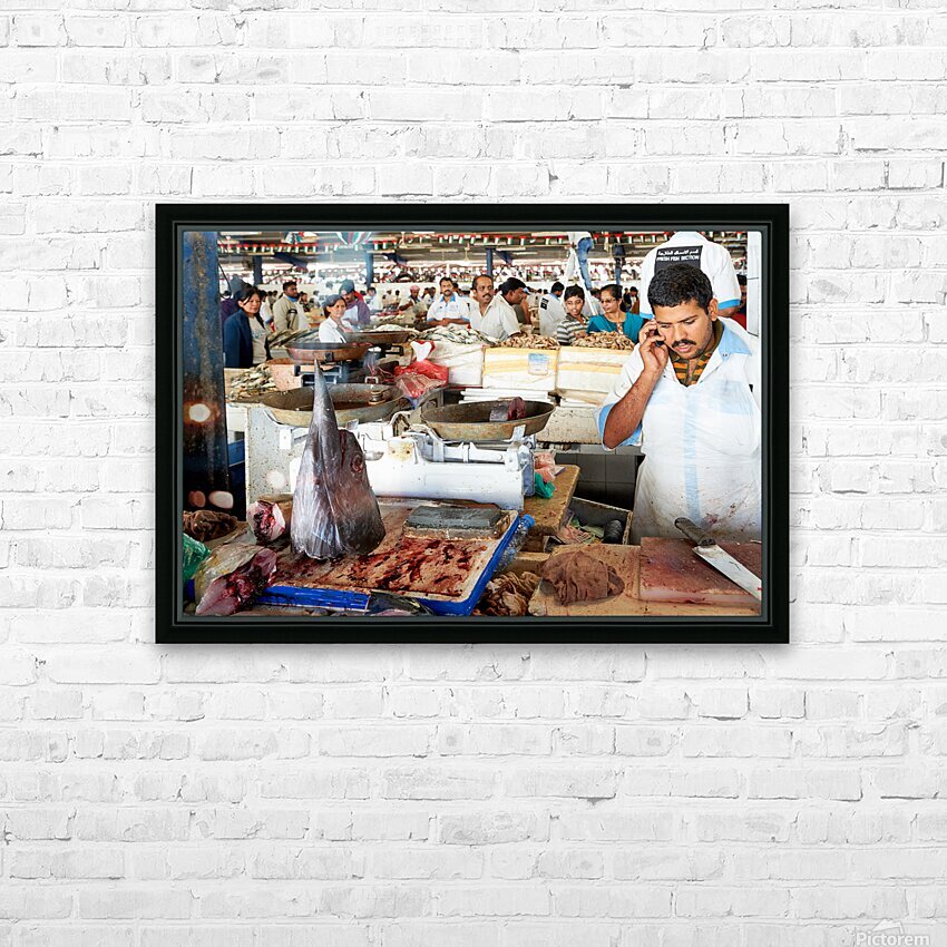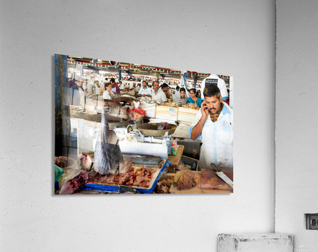Get this artwork "Man talks on phone at busy fish market in Dubai UAE" in a framed print.