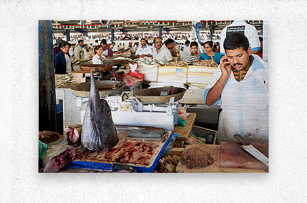 ABOUT THIS ARTWORK: MAN TALKS ON PHONE AT BUSY FISH MARKET IN DUBAI UAE