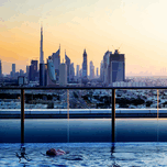 SWIMMING IN INFINITY POOL OVERLOOKING DUBAI SKYLINE AT SUNSET