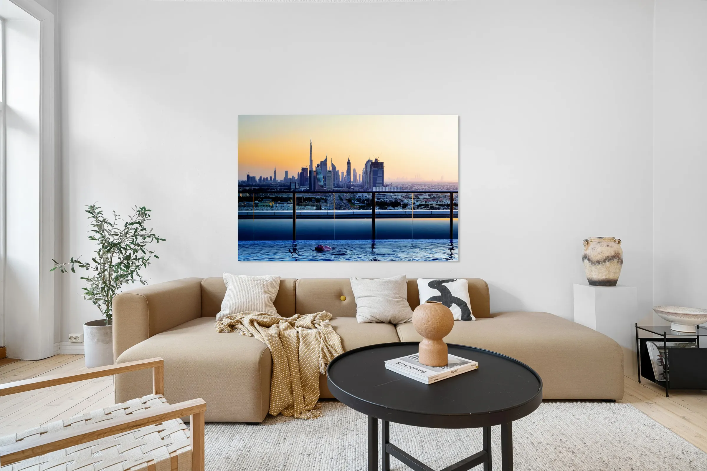 Swimming in infinity pool overlooking Dubai skyline at sunset Frame print